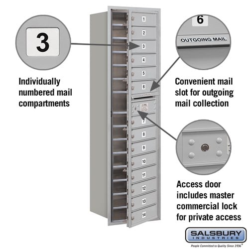 This recessed mounted mailbox features 14 doors and is constructed from heavy-duty aluminum with a durable powder-coated finish. Designed for private access, it includes secure cam locks and is ADA compliant.