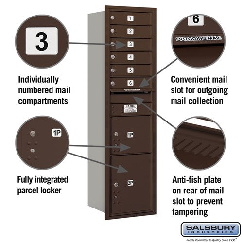 This recessed mounted mailbox offers maximum height with 6 mail compartments and 2 parcel lockers, designed for USPS access and rear loading. Constructed from heavy-duty aluminum with a durable powder-coated finish, it ensures security and longevity.