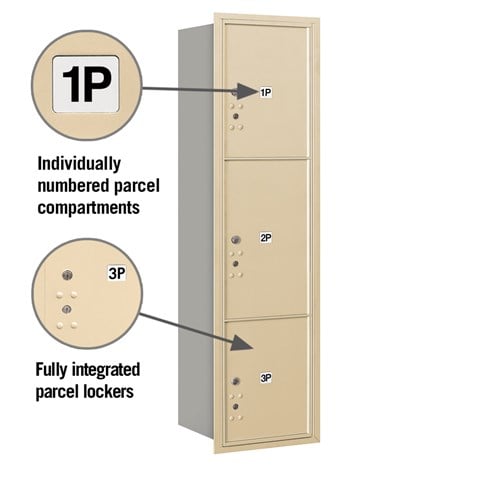 This recessed mounted parcel locker is designed for USPS access and features three parcel lockers in a sandstone finish. Constructed with heavy-duty aluminum and stainless steel hardware, it is ideal for apartments, commercial buildings, and residential developments.