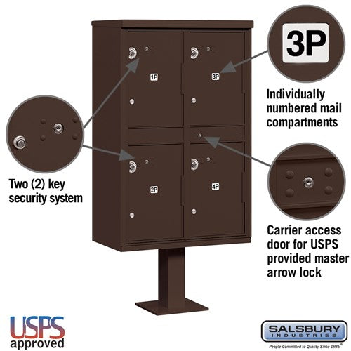 The Outdoor Parcel Locker with 4 Compartments in Bronze is a durable and secure solution for receiving packages. Constructed from heavy-duty aluminum and stainless steel, it features a powder-coated finish and USPS-approved design, making it ideal for residential and commercial use.