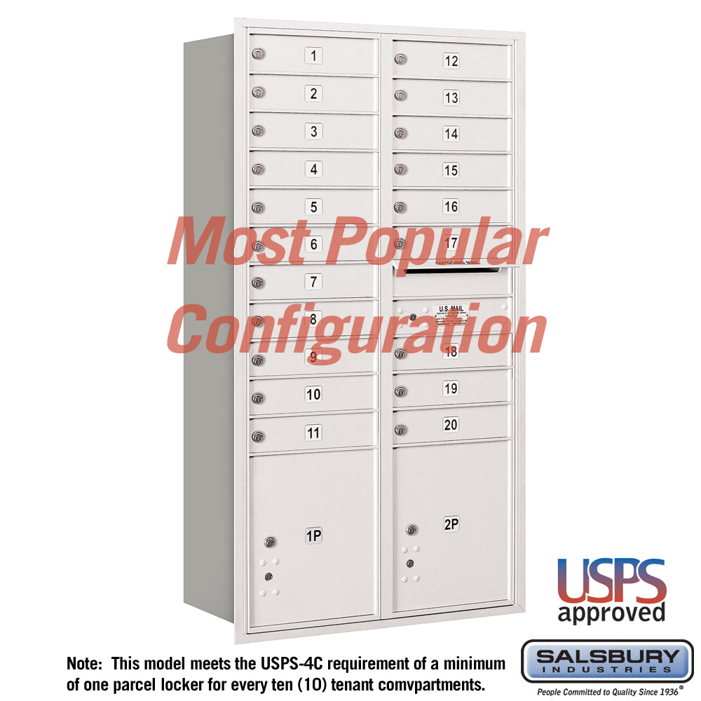Recessed Mounted 4C Horizontal Mailbox - Maximum Height Unit, Double Column, 20 MB1 Doors, 2 PL4.5 Parcel Lockers, Front Loading, USPS Access