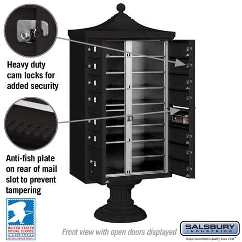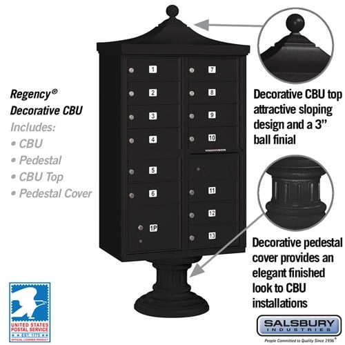 Regency Decorative Cluster Box Unit with 13 Doors and Parcel Locker in Black with USPS Access