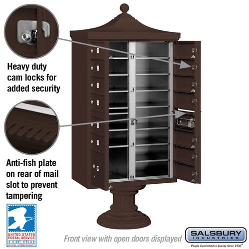 The Regency Decorative Cluster Box Unit transforms mail storage into a statement of sophistication. Its bronze powder-coated finish and decorative pedestal design exude timeless elegance, making it a perfect addition to upscale residential or commercial spaces. Pair it with complementary landscaping or architectural elements to create a cohesive and inviting environment. This unit is not just functional; it’s a testament to refined taste and practical luxury.