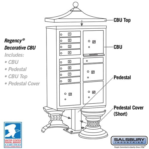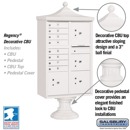 The Regency Decorative Cluster Box Unit transforms any outdoor area into a sophisticated and functional space. Its durable aluminum construction and powder-coated finish ensure lasting beauty, while the decorative top and pedestal cover add a touch of refinement. Perfect for residential or commercial settings, this mailbox unit combines practicality with style, making it an essential addition to any well-designed environment.