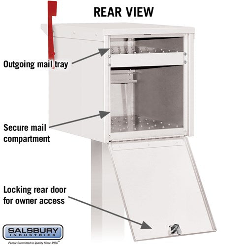 The Roadside Mailbox in White is a durable and secure solution for mail storage, featuring a powder-coated aluminum construction and front and rear locking doors. Designed to meet USPS standards, it offers convenience and style for residential or commercial use.
