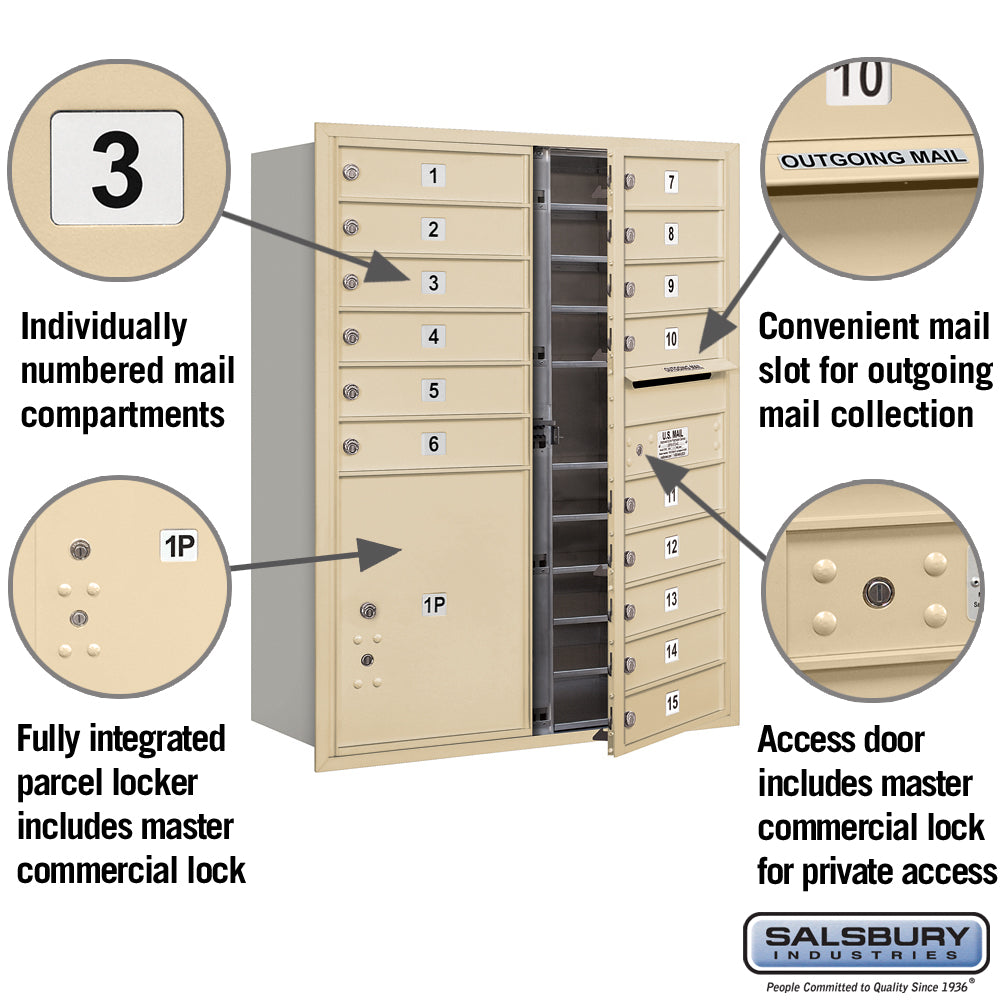 Salsbury 11-Door-High Recessed Mounted 4C Mailbox, 15 Compartments + PL5 Parcel Locker, Sandstone Finish