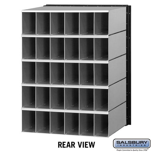 Durable Salsbury 2200 Series rear‑loading mailbox unit with 30 combination‑lock doors, ideal for private access mail distribution. Constructed with 20‑gauge steel compartments and 1/4" extruded aluminum doors in a powder‑coated finish, designed to stack and mount between studs for secure, space‑efficient installations.