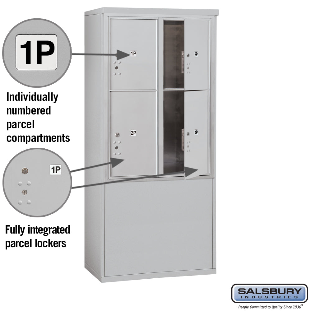 A durable, free-standing 4C parcel locker system designed for USPS access, ideal for apartments, commercial buildings, and residential developments. Constructed from heavy-duty aluminum with stainless steel hardware and a powder-coated finish for indoor or outdoor use.