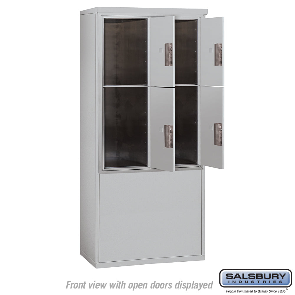 A: This 11-door-high, double-column unit includes 2 PL5 and 2 PL6 stand-alone parcel lockers.
