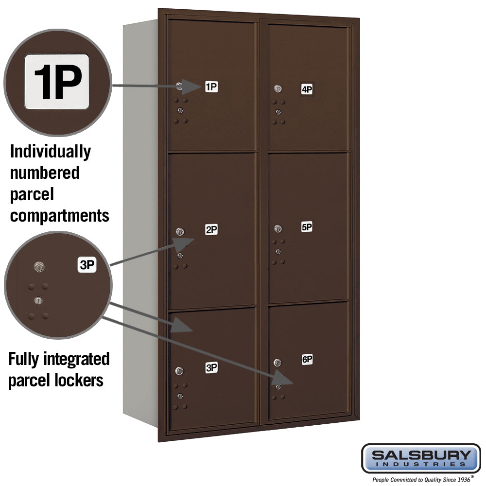 Heavy-duty recessed-mounted 4C parcel locker with six compartments provides secure USPS-approved package delivery for multifamily and commercial buildings. Built from all-aluminum with stainless hardware and a durable powder-coated bronze finish, this maximum-height unit is designed for indoor or outdoor use.