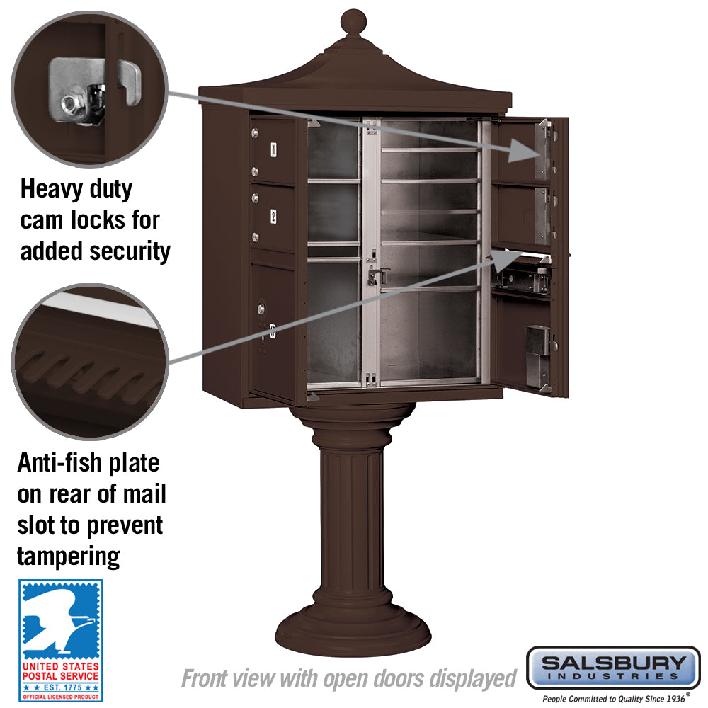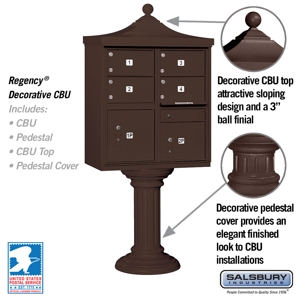 USPS-approved Salsbury Regency decorative cluster box unit combines secure mail and package delivery with an elegant pedestal and top. Built from heavy-duty aluminum with stainless steel hardware and a durable powder-coated bronze finish, it features 4 C-size tenant doors and 2 integrated parcel lockers for small communities or commercial sites.