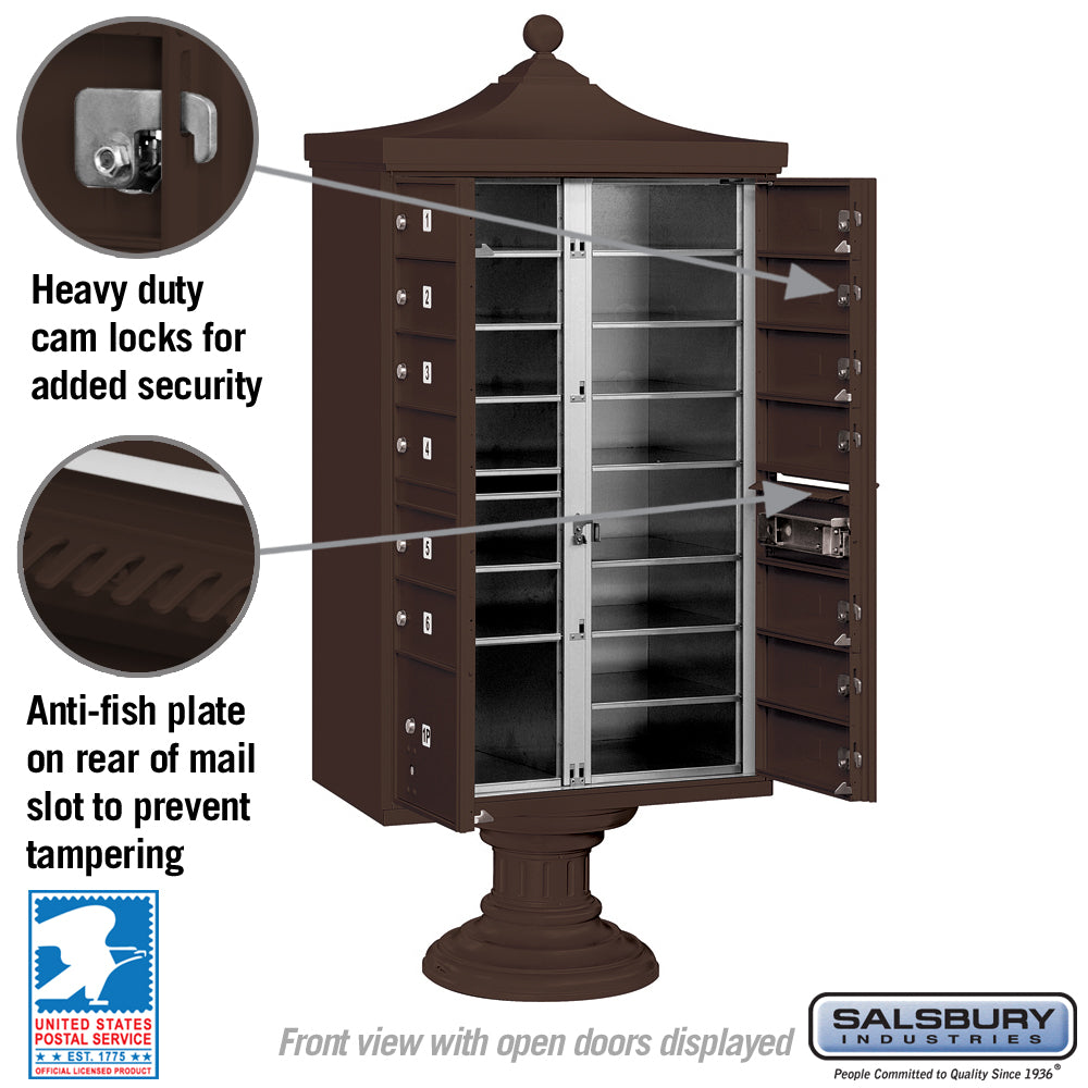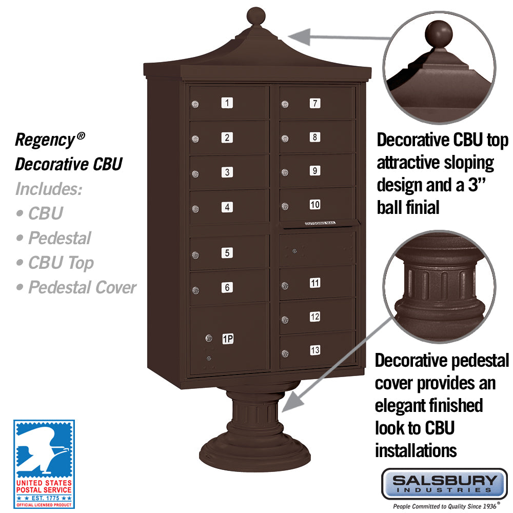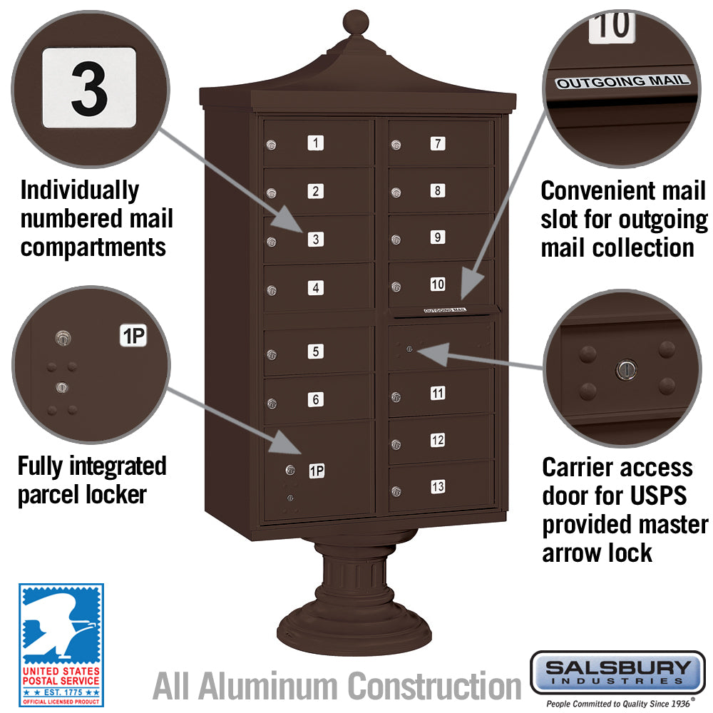 This Salsbury Regency decorative cluster box unit provides secure USPS-access mail delivery for communities and campuses. Built from heavy-duty aluminum with stainless steel hardware, it includes 13 tenant doors, one integrated parcel locker, and a decorative top and pedestal in a durable bronze powder-coat.