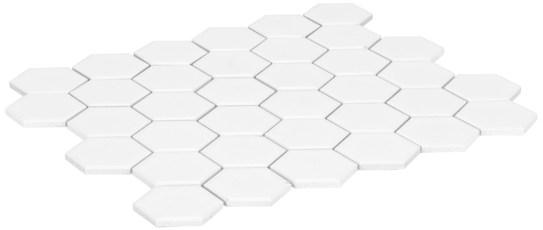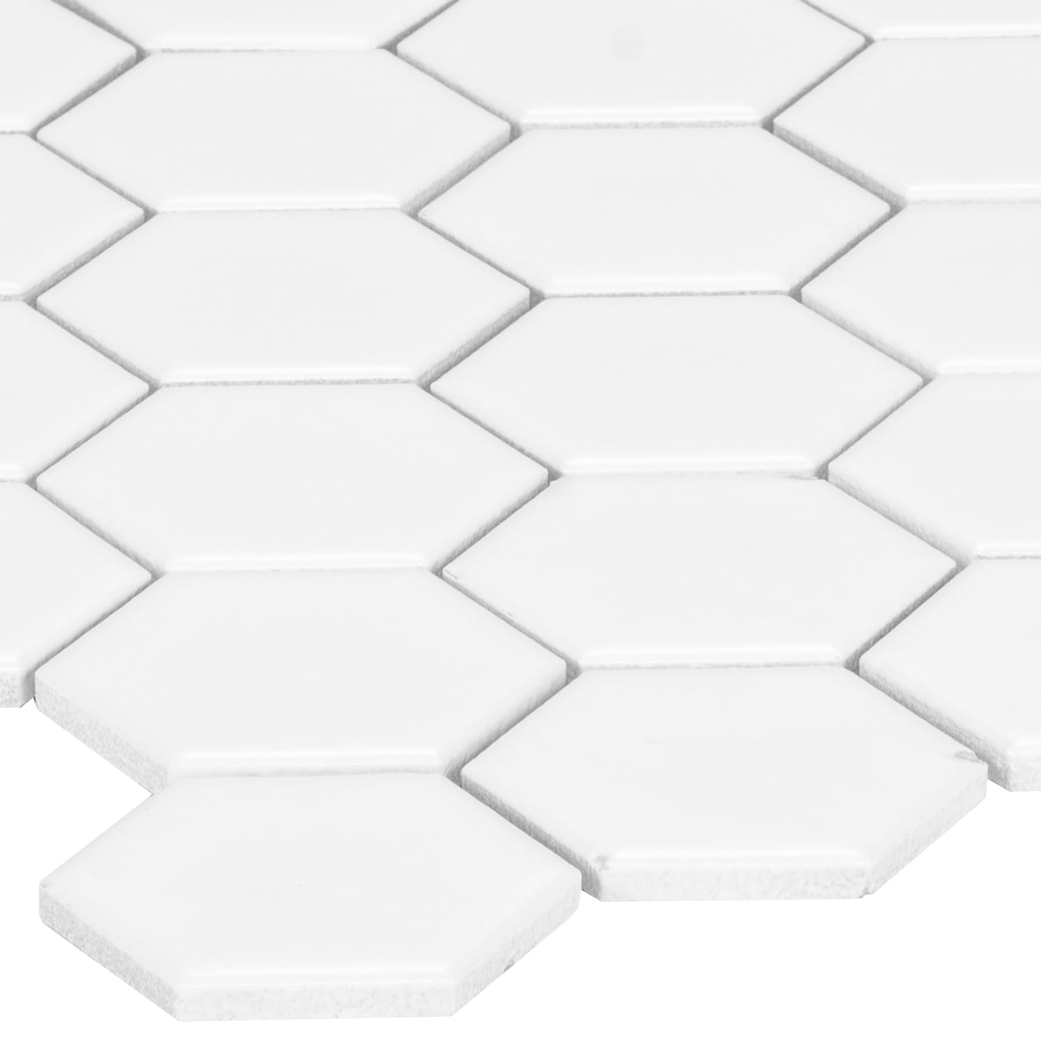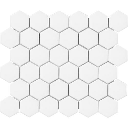 A crisp brilliant white hexagon mosaic in durable porcelain with a matte finish. Designed for floors and walls, it offers improved slip resistance and waterproof performance for kitchens, baths, and showers.