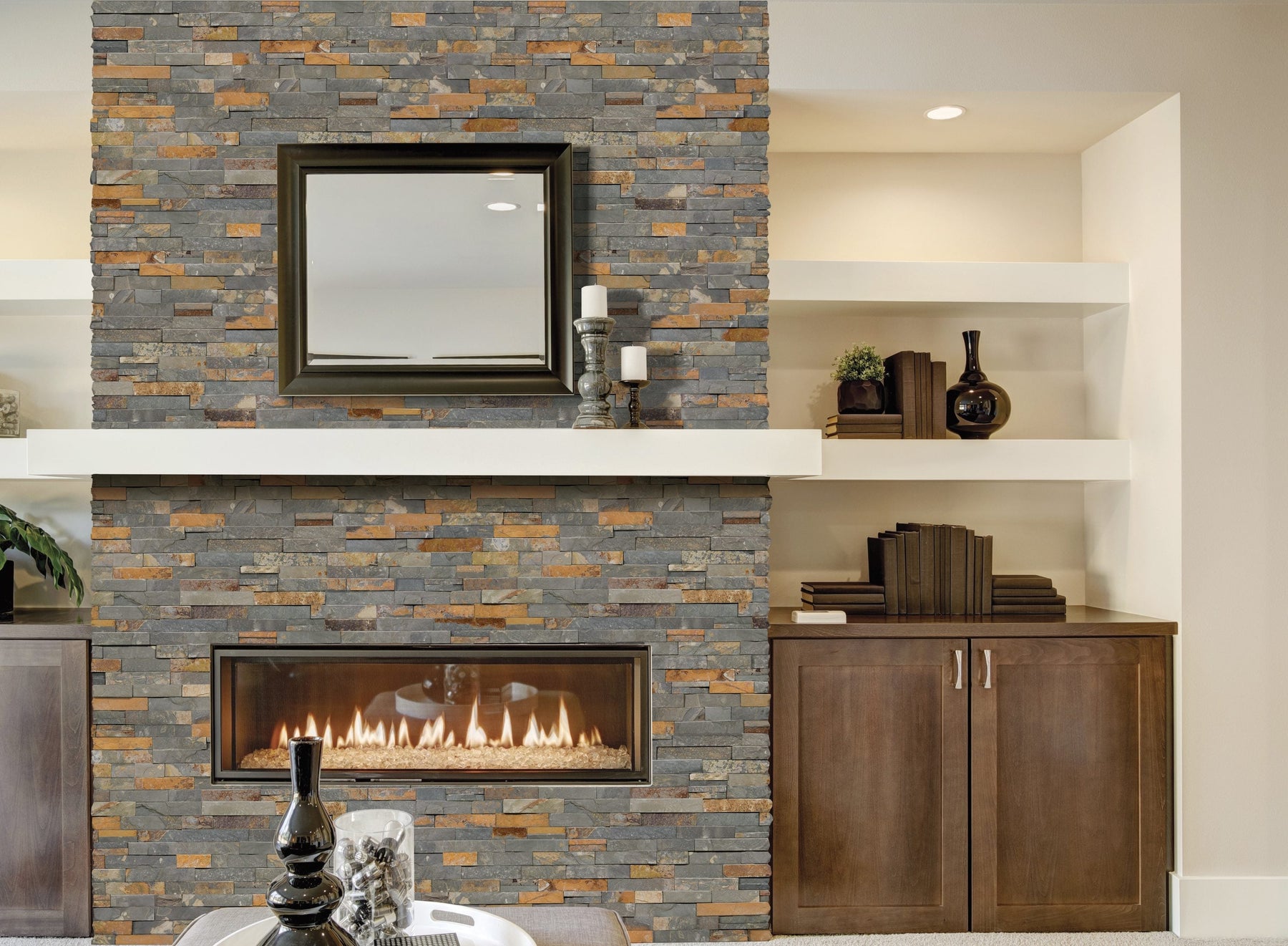 Oxide Ledgestone wraps walls in a moody palette of charcoal and ember, sculpted in layered slate that feels both tailored and organic. The staggered profile catches light, creating a dynamic rhythm that elevates a fireplace or feature wall. Pair it with crisp white shelving and warm wood to let the stone’s tonal story sing. It’s an effortless path to that collected, luxurious look.