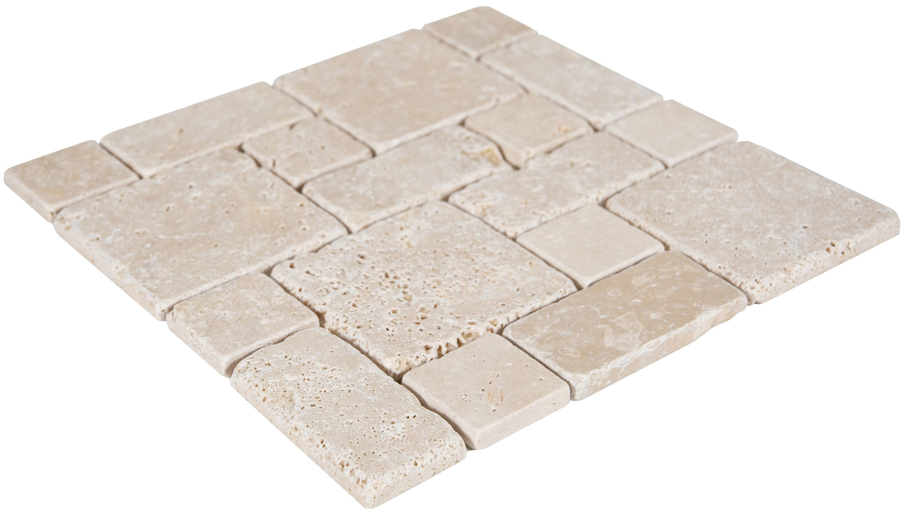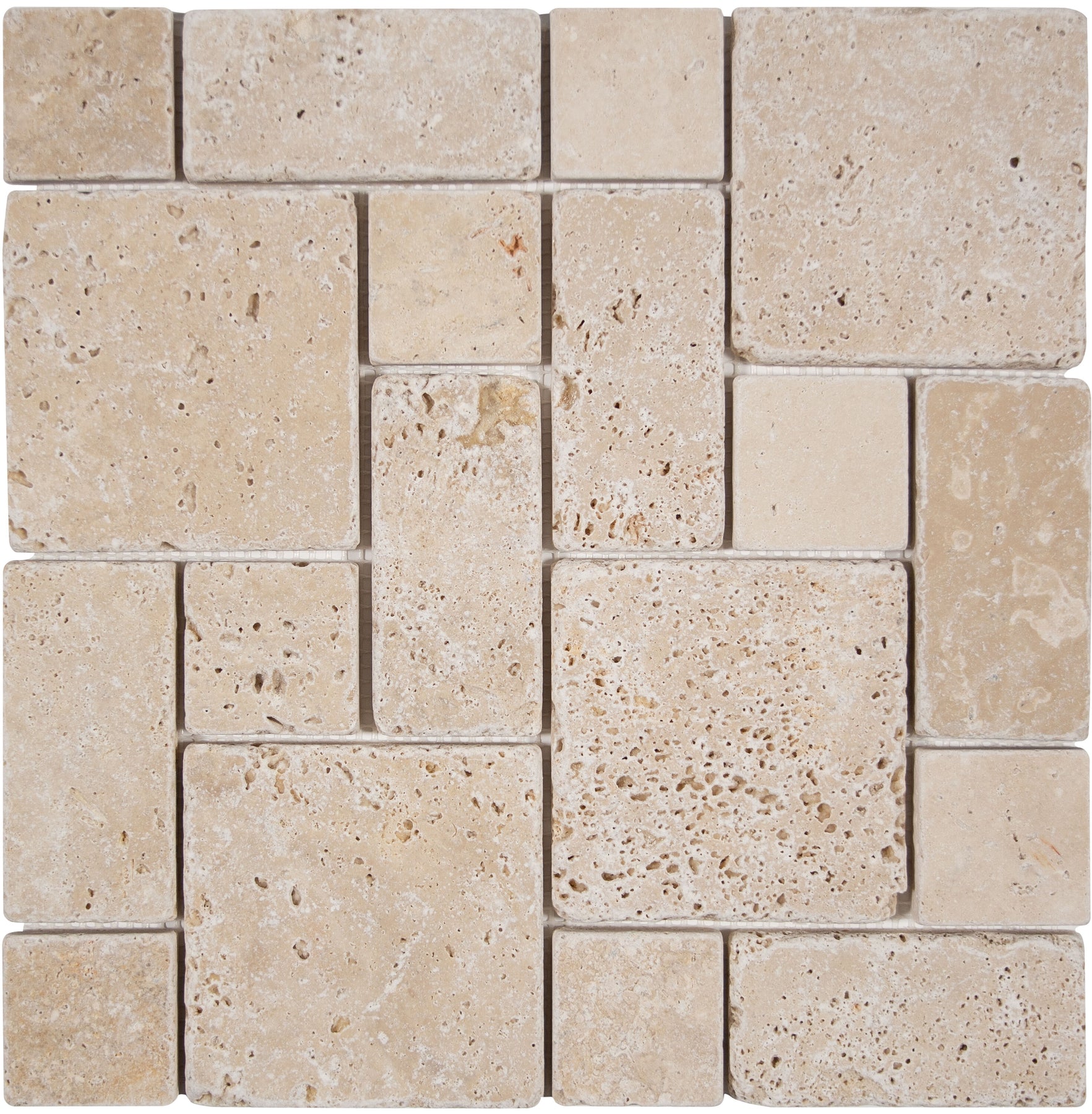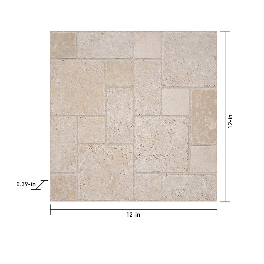 Elevate floors and walls with this honed natural travertine mosaic from Satori. The 12-in x 12-in sheet features warm ivory and tan tones with a multi-shaped Versailles pattern, ideal for indoor or outdoor spaces. Each piece covers 1 sq ft and delivers durable, timeless stone character.