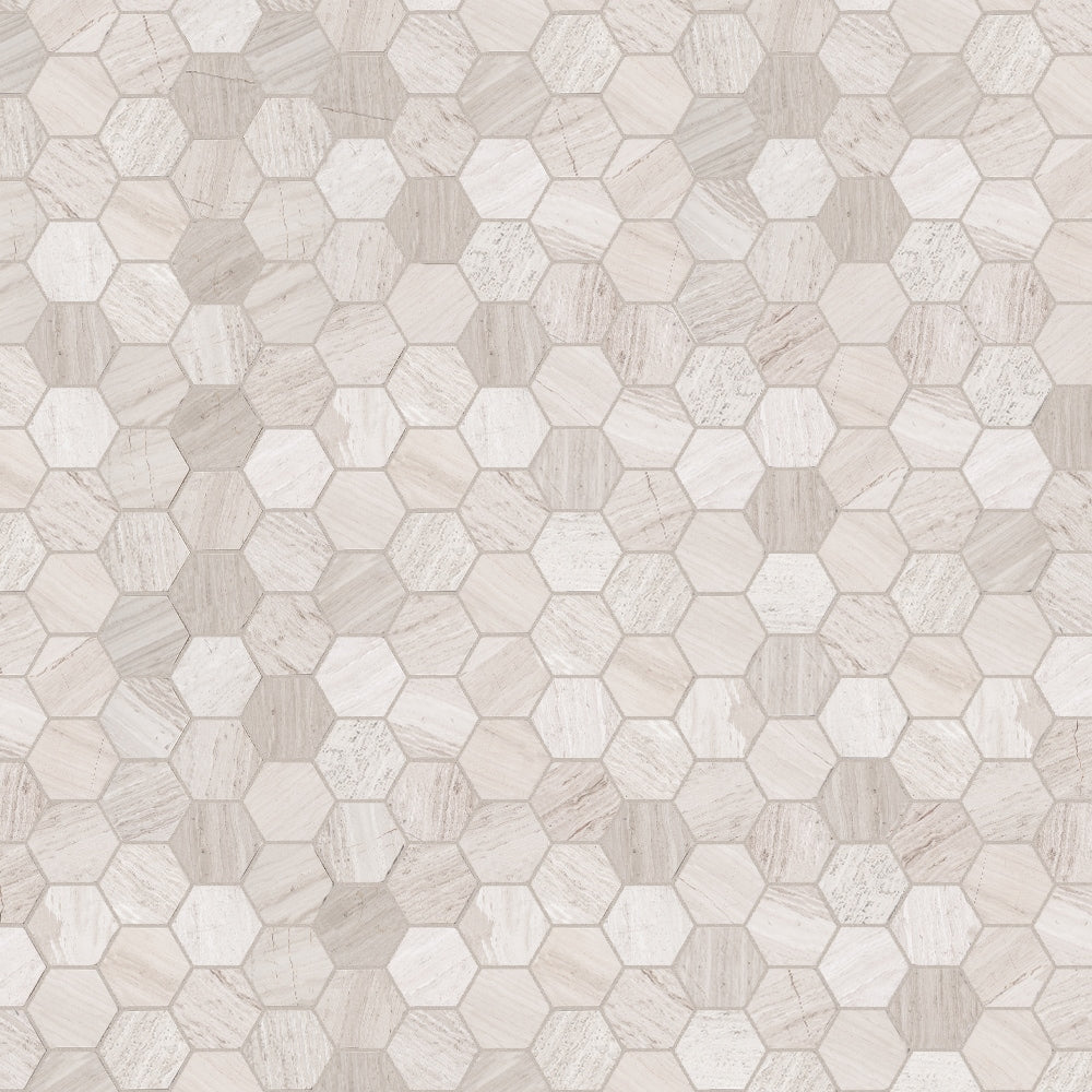 The Satori Mystery Natural Stone Hexagon Tile brings a polished, elegant marble look to your spaces. Its hexagon pattern and rectified edges create a seamless and refined aesthetic that's perfect for bathrooms, kitchens, and accent walls. Ideal for both medium and high-traffic areas, this tile combines beauty with durability and is suitable for wet environments.