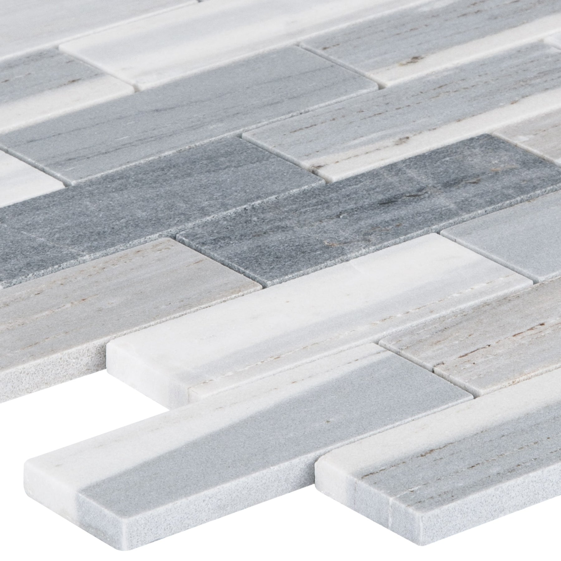 Polished natural marble mosaic in a brick pattern featuring blue-gray and white tones for a refined marble-look wall surface. Each 12-in x 12-in sheet covers 0.97 sq ft and is ideal for backsplashes, accent walls, and shower surrounds.