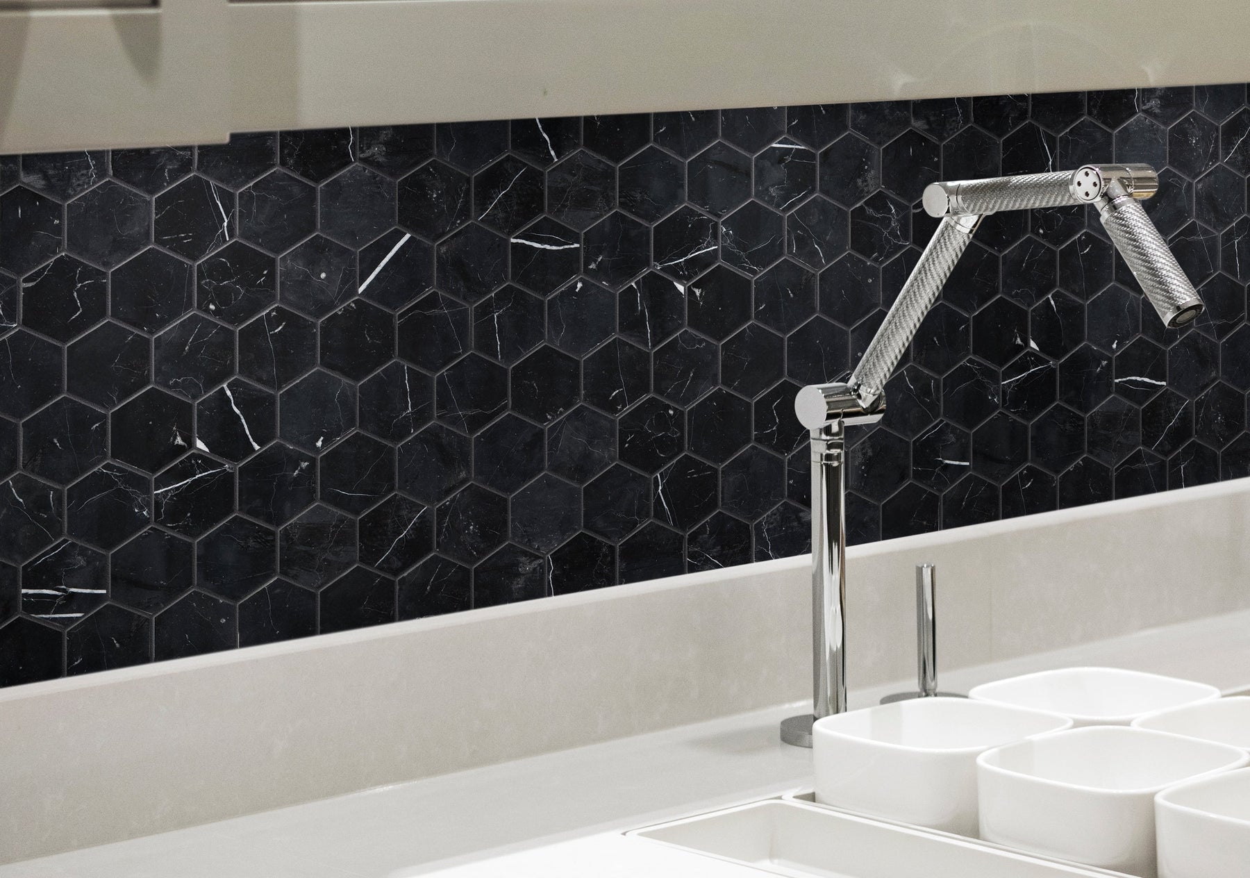 Transform your space with the timeless elegance of Satori Nero Polished Hexagon Mosaic Tile today!