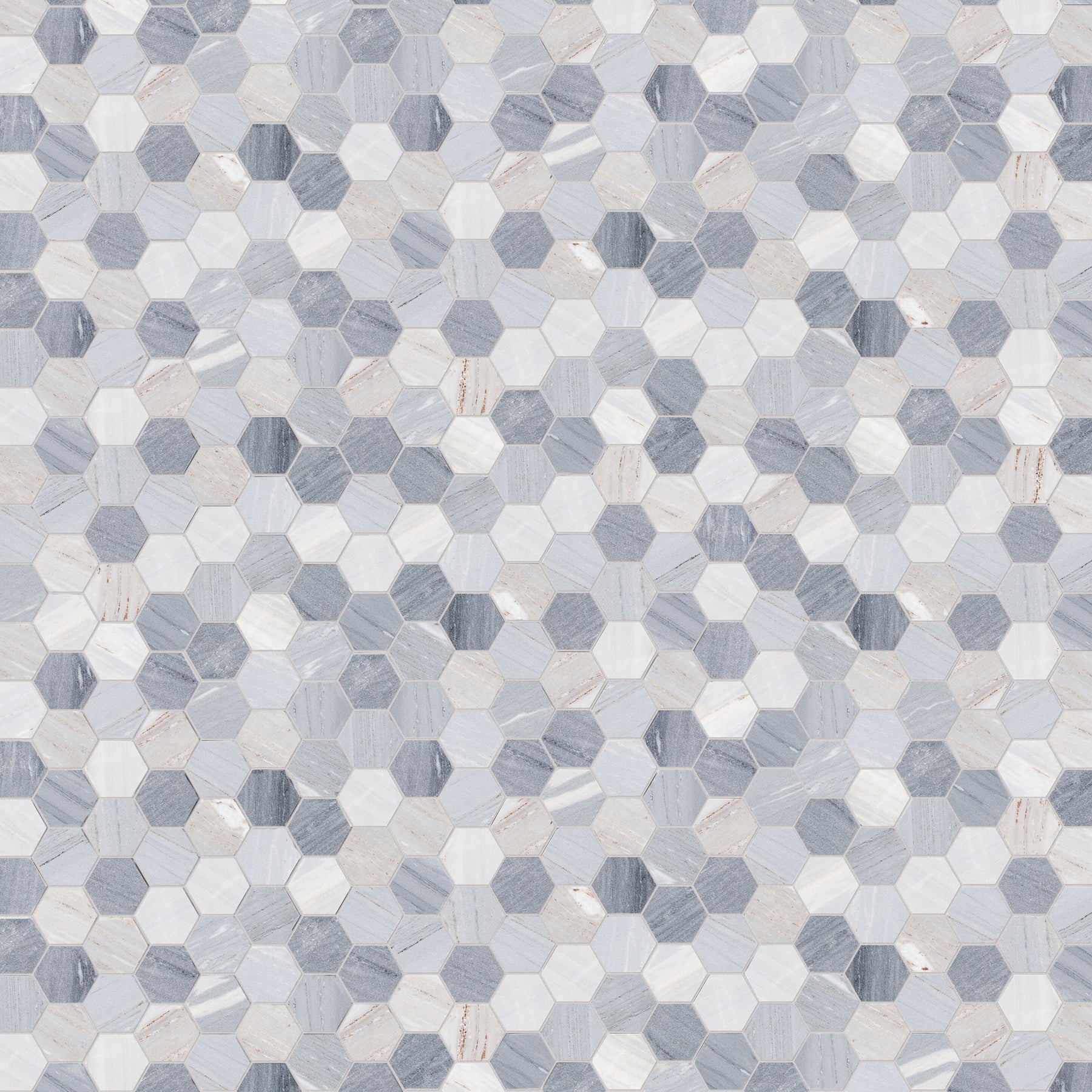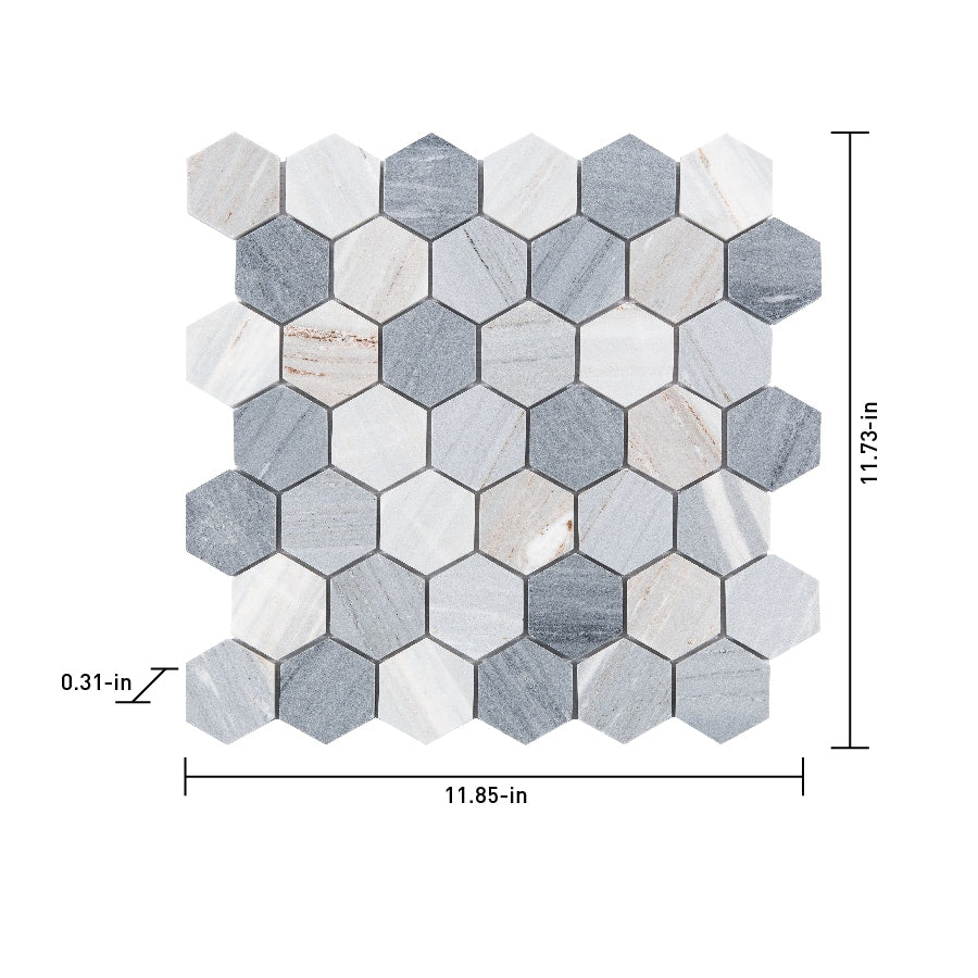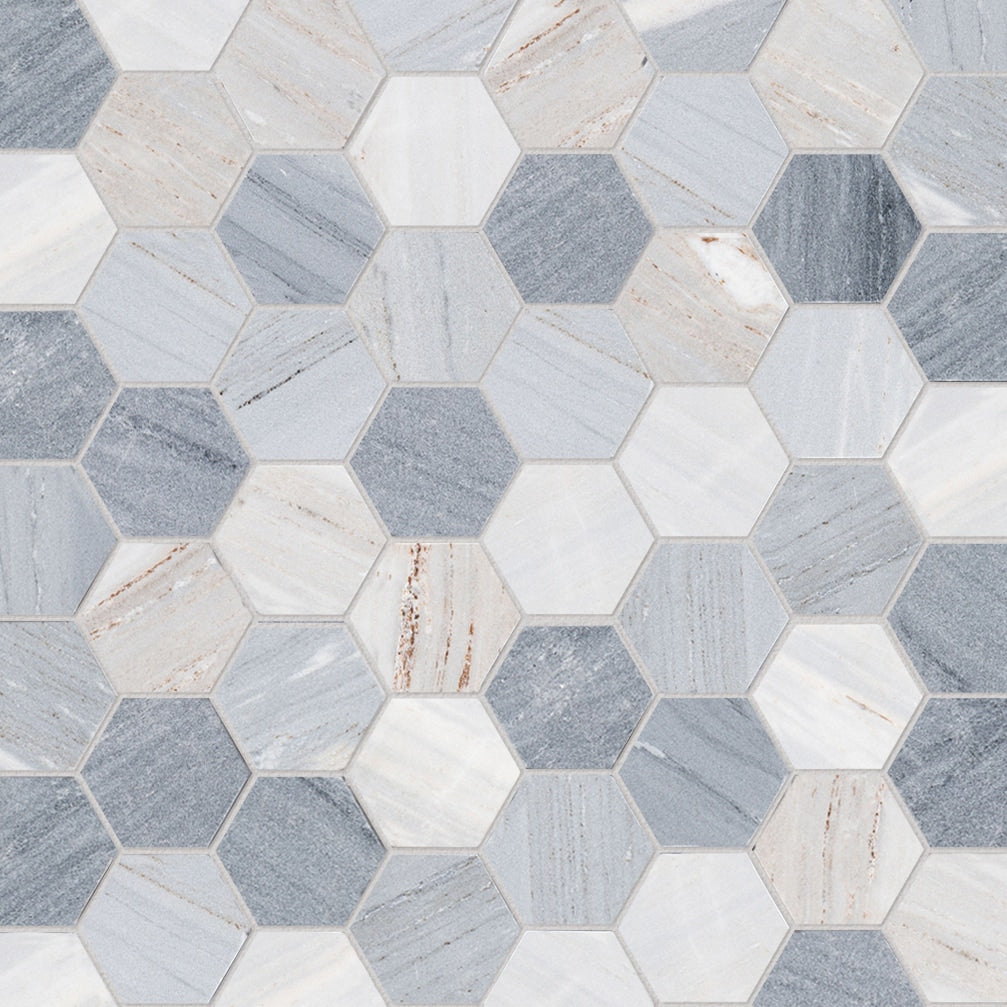 Transform your interior with the Satori Palissandro Polished Hexagon Mosaic Tile, featuring a stunning natural stone look with a captivating mix of blue and gray hues. Ideal for both floors and walls, its polished finish adds a luminous shine, making any space feel luxurious. Designed for medium to heavy traffic areas, this marble tile is perfect for your residential or commercial interiors.