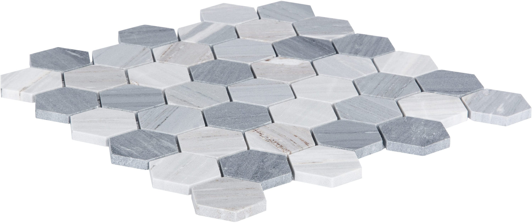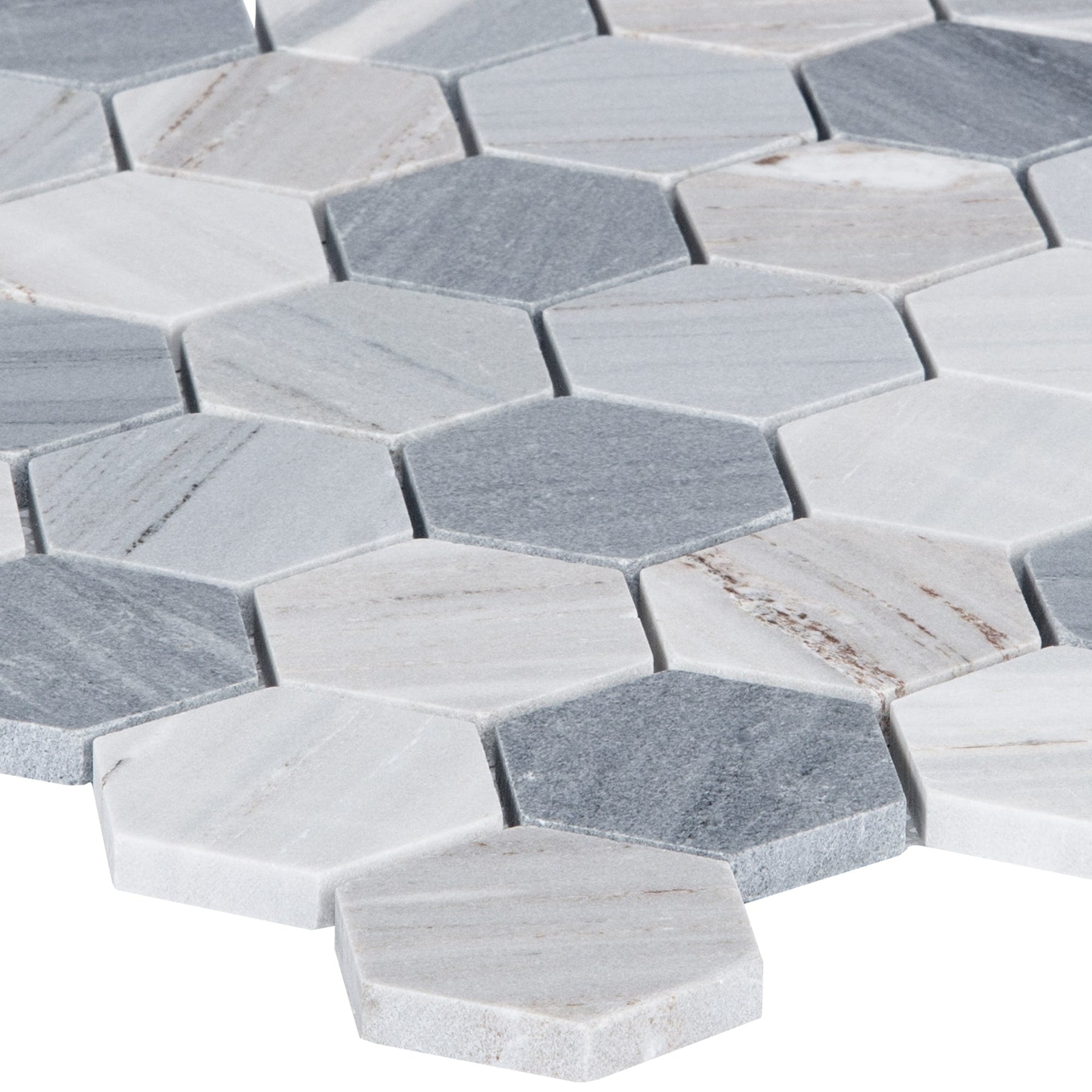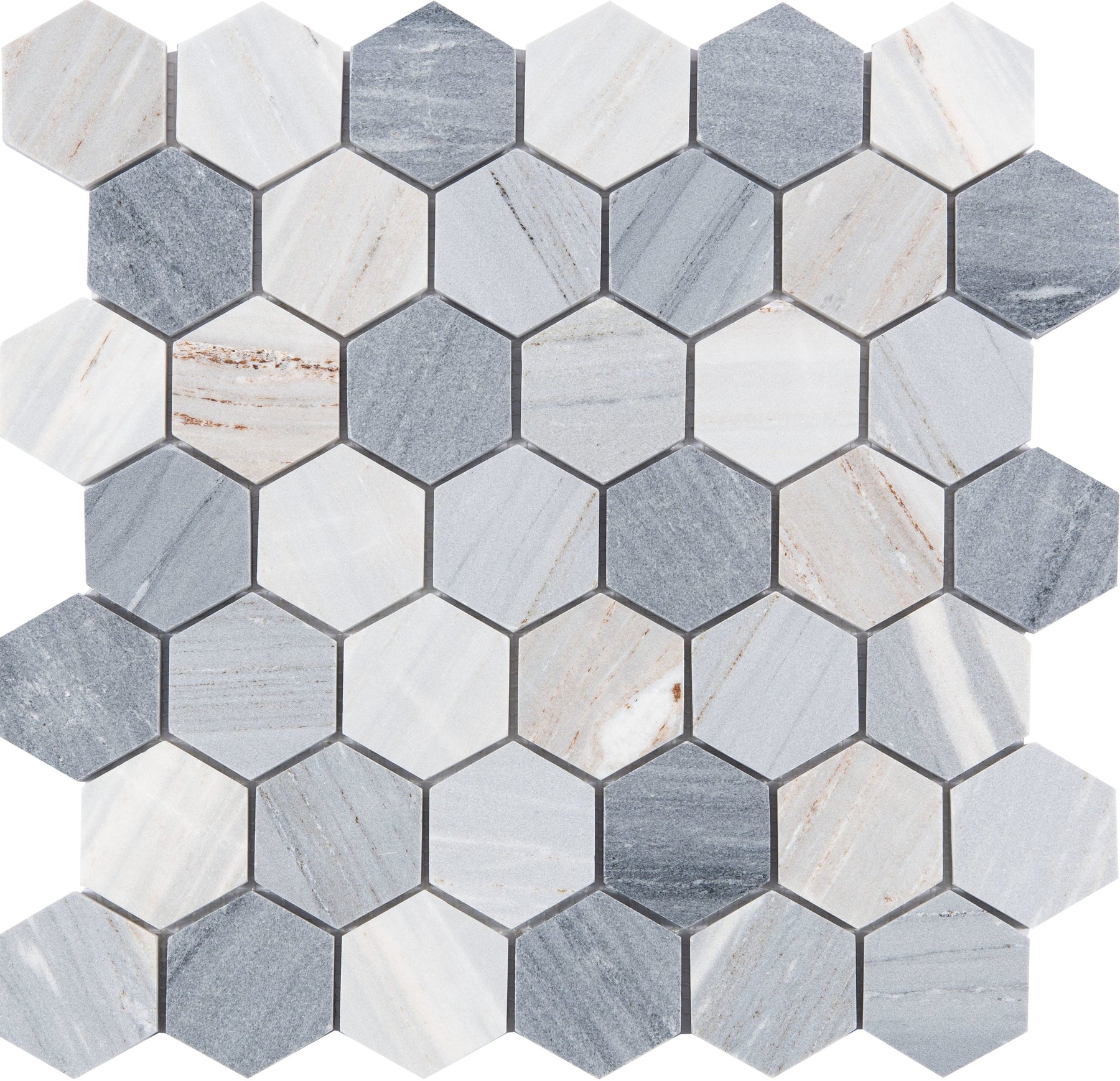 Transform your interior with the Satori Palissandro Polished Hexagon Mosaic Tile, featuring a stunning natural stone look with a captivating mix of blue and gray hues. Ideal for both floors and walls, its polished finish adds a luminous shine, making any space feel luxurious. Designed for medium to heavy traffic areas, this marble tile is perfect for your residential or commercial interiors.