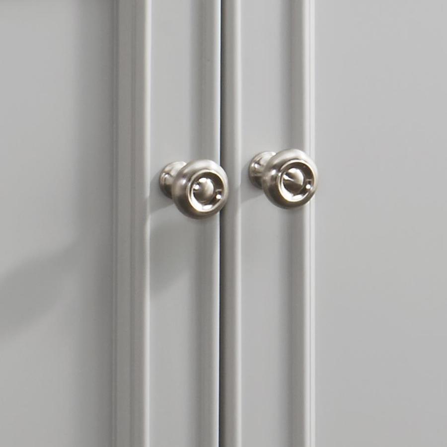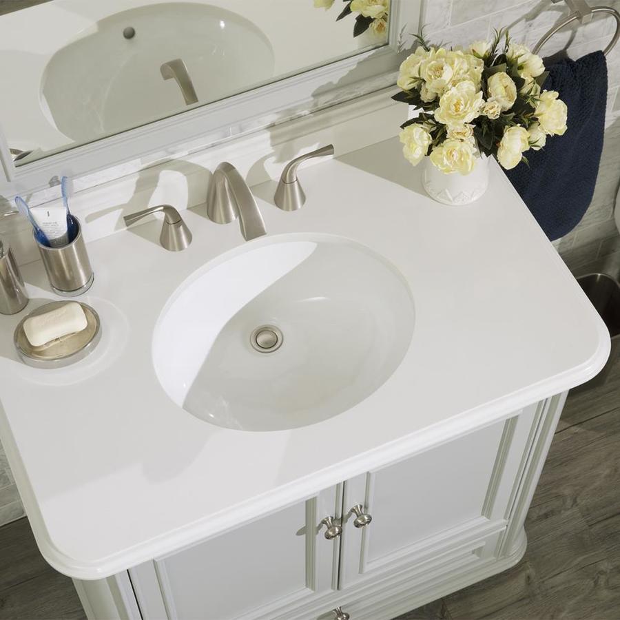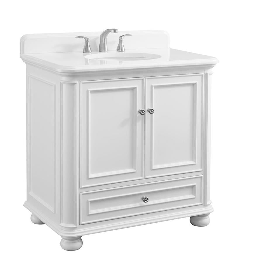 Bath vanities designed by Drew and Jonathan Scott to enhance and modernize any bathroom Vanities designed with signature Scott design style White engineered stone top with 4-in backsplash and oval Undermount ceramic sink with overflow (cUPC Certified) Pre-drilled for 8-in widespread faucet (sold separately) One storage drawer features dovetail construction and premium soft-close undermount drawer glides Doors feature soft close European hinges Brushed nickel finish drawer pulls Crafted from solid wood and wood veneer construction Some assembly required