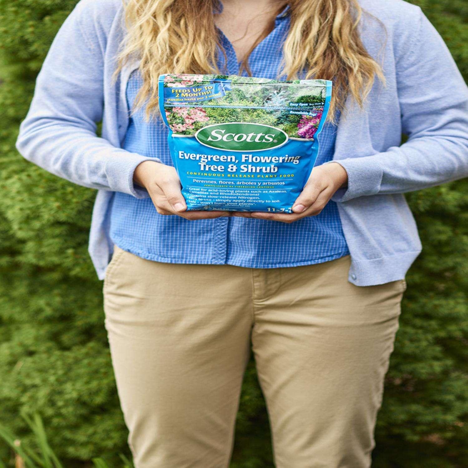 Encourage vigorous root growth and lush foliage in trees and shrubs with Scotts Evergreen, Flowering Tree and Shrub Continuous Release Plant Food. The formula is excellent for evergreens, dogwoods, hydrangeas, magnolias and many other acid-loving trees and shrubs like azaleas, camellias and rhododendrons. Simply apply the plant food directly to the soil and the formula is safe, so you can trust it won’t burn your plants when you use it as directed.