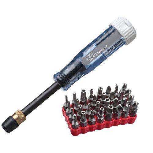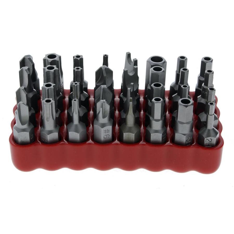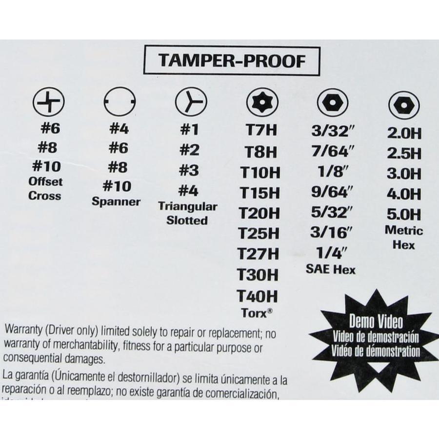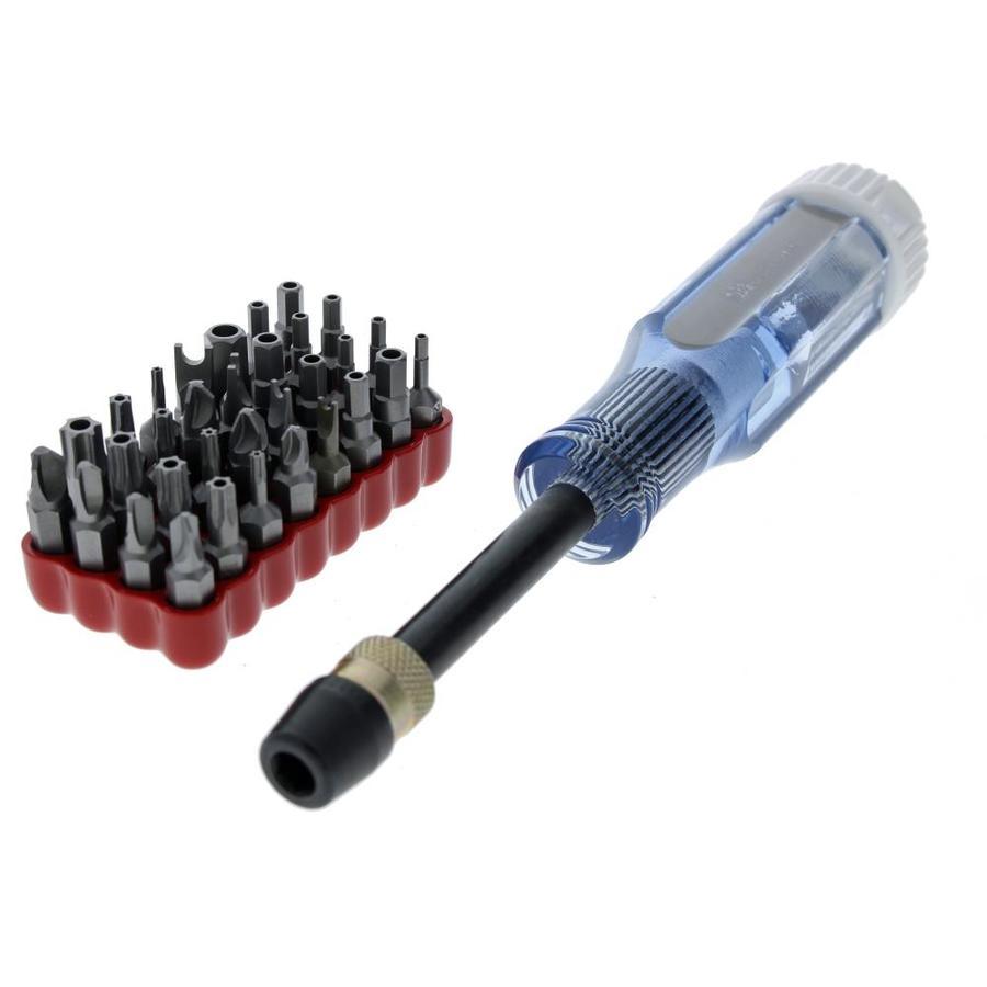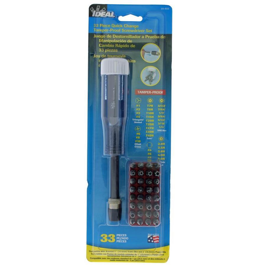 33-piece quick change set Patented Sure-Loc™ quick change chuck securely holds bits Includes 32 piece tamper proof bits with storage block Bits fit most standard multi-bit screwdrivers Built-in bit storage container in handle hold up to 5 extra bits