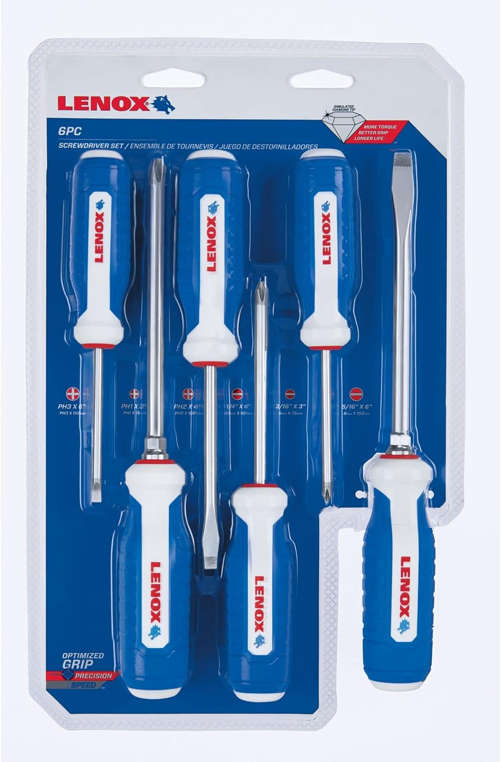 LENOX 6‑Piece Screwdriver Set – Sizes: PH #1 x 3", PH #2 x 4", PH #3 x 6", CB 3/16" x 3", SL 1/4" x 4", SL 5/16" x 6"
