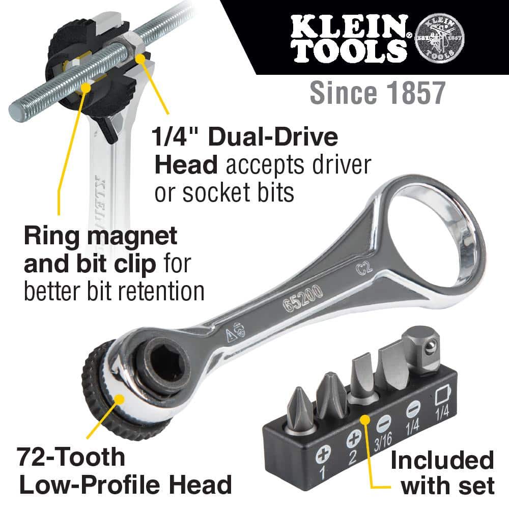 Klein Tools 1/4 in. Drive Electrician's Mini Ratchet Set with Screwdriver Bits and Adapter, 3.5 in Handle, 72-Tooth (Model 65200)