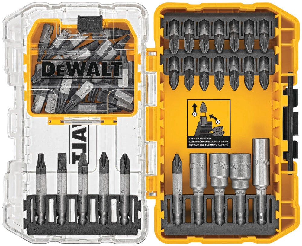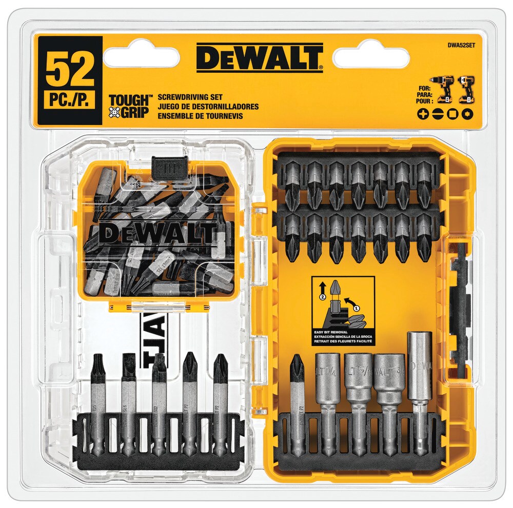 A 52-piece DEWALT Tough Grip screwdriving set built from durable steel for impact-compatible performance. Packed in a hard ToughCase+ connectable case, it covers common fastener types and sizes for drills and impact drivers.