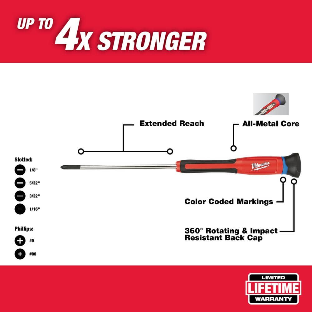 A 12-piece precision screwdriver set combining Phillips and Torx drivers with all‑metal cores for up to 4x strength. Precision machined tips, extended reach shanks, and chrome plating deliver secure fitment, visibility, and corrosion resistance—ideal for delicate electronics and fine adjustments.