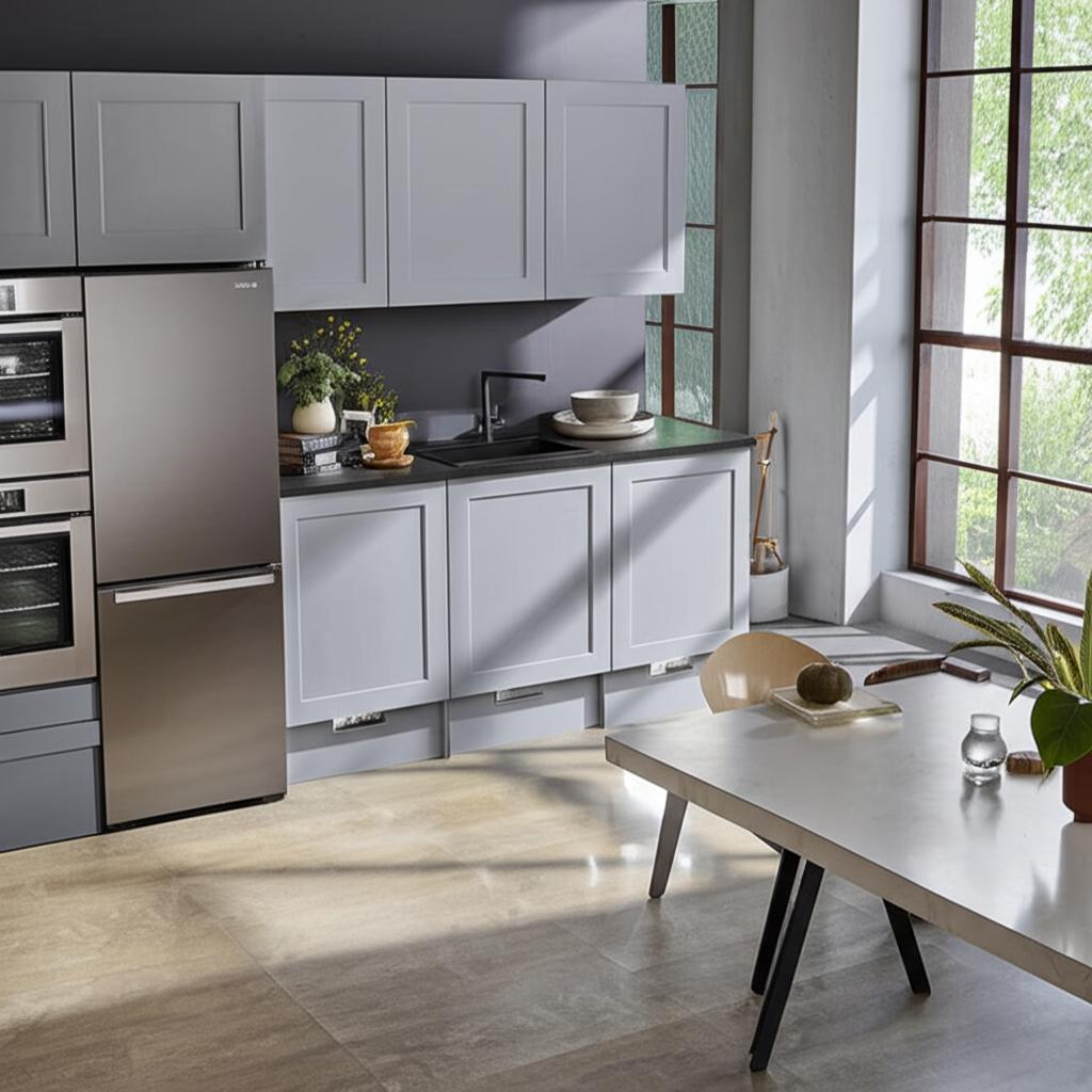 A: The gray Thermofoil finish is both durable and easy to maintain, ideal for kitchen environments.