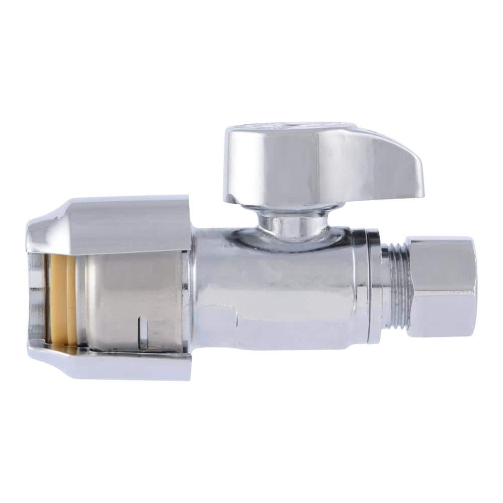 Chrome-plated brass stop valve with push-to-connect inlet and 3/8 in. O.D. compression outlet for fast, tool-free shutoff connections to faucets or toilets. Compatible with PEX, copper, CPVC, and PE-RT, this quarter-turn valve installs on wet lines and can be rotated after installation. Engineered with stainless steel retainer and O-ring seal for durable, leak-tight performance.