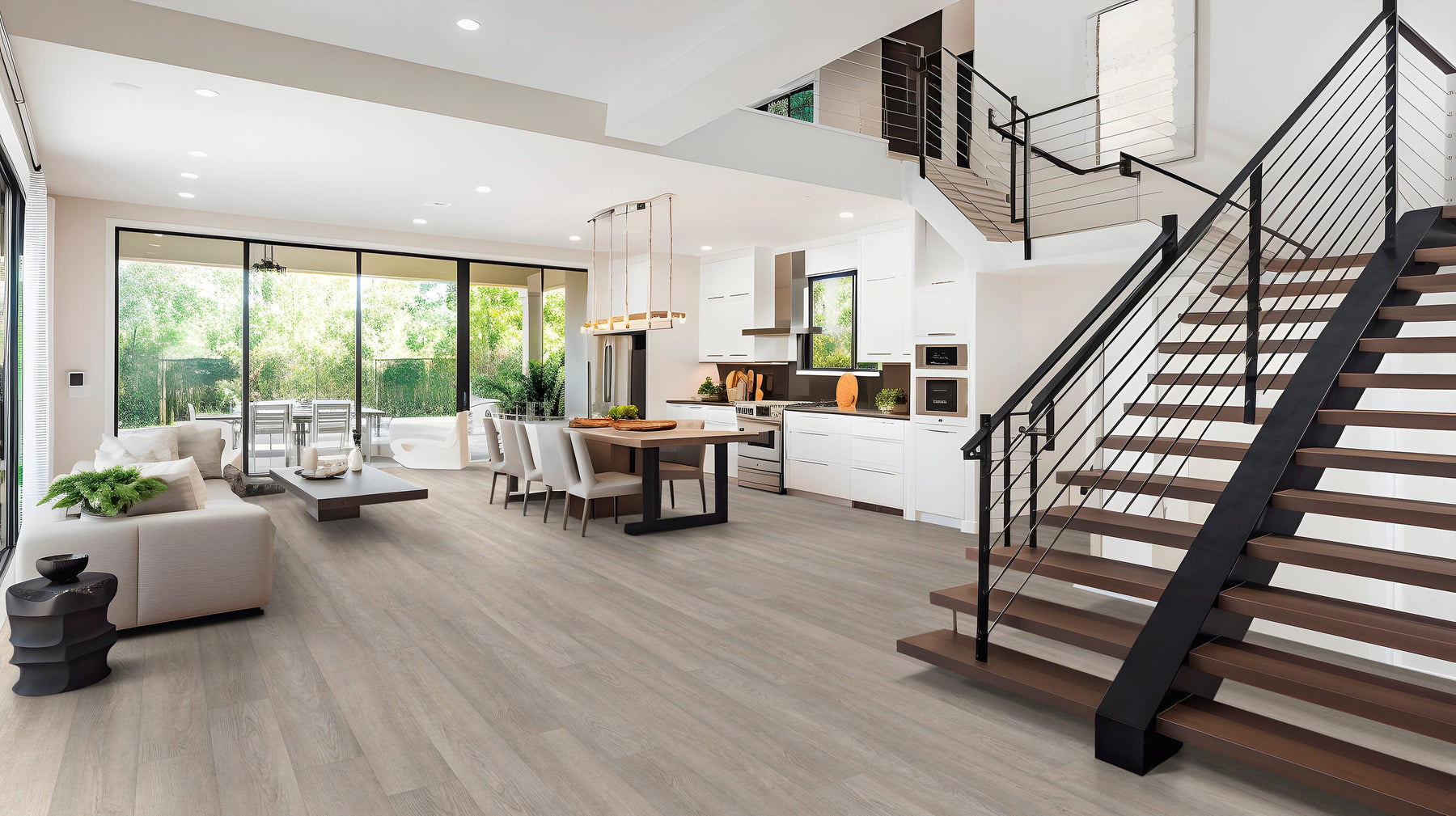 The Parallax HD Plus Sapling Gray flooring invites an elevated sense of luxury into your interiors with its authentic wood visuals and textured detailing. This vinyl flooring artfully balances rustic charm with modern flair, instantly transforming any room. Create an inviting ambiance by pairing it with plush area rugs and soft textiles, perfect for creating an inviting living space. With its seamless blend of style and practicality, this flooring is a staple of sophisticated decor that enhances both home and commercial environments.