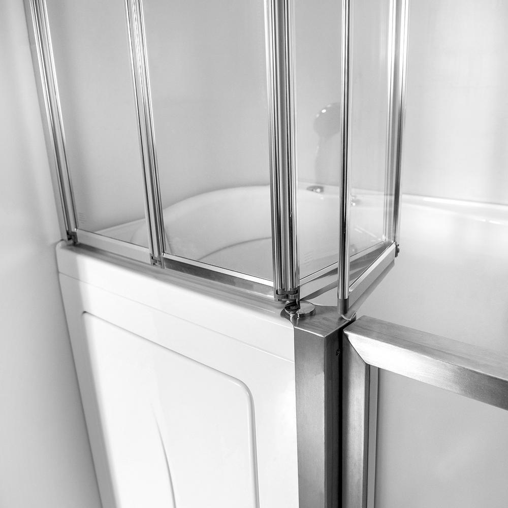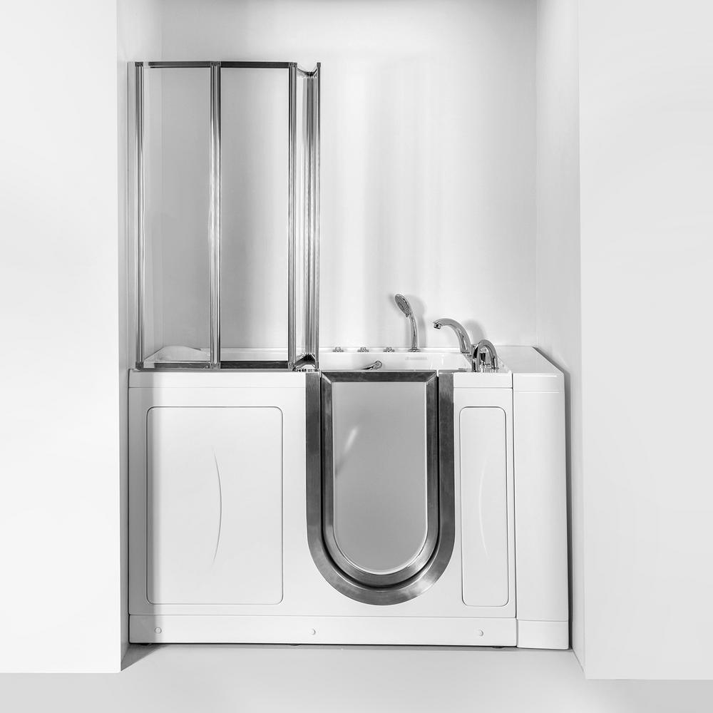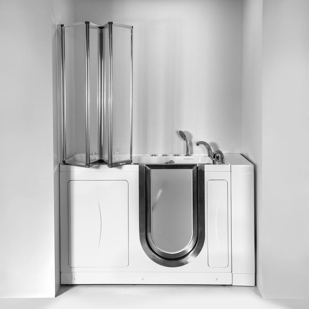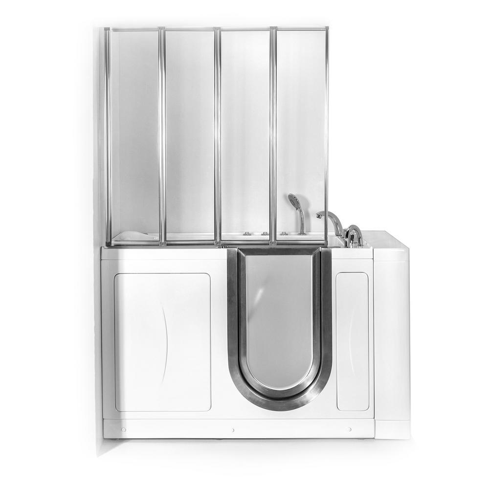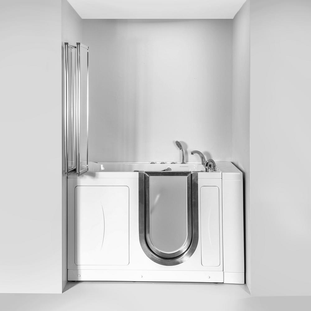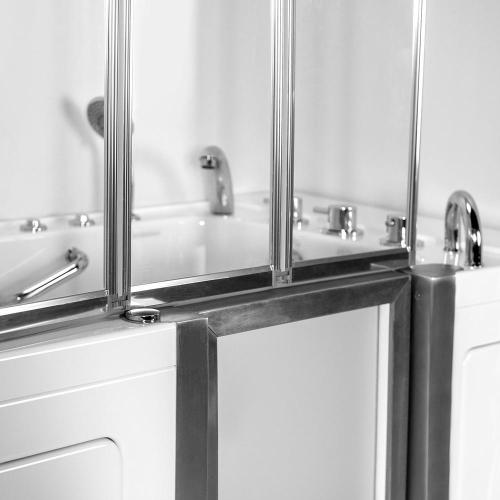 A premium walk-in bathtub combining whirlpool and air massage therapy with a sleek stainless steel, inward-swing door. Features fast-fill thermostatic faucet, proprietary dual drain technology for rapid gravity drainage, and an included folding shower screen for versatile bathing.