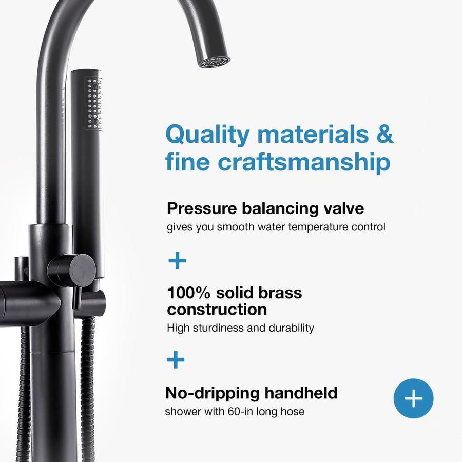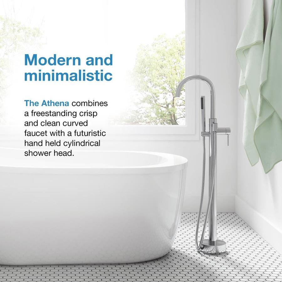 Chrome finish bathtub faucet from the Athena collection combines a sleek profile with modern design Tub and shower faucet set with a single-lever gives you precise control over temperature and flow Stylish hand-held shower with 60-in long hose provides you with extended reach and versatility while bathing Pressure balancing valve maintains constant water temperature when water pressure suddenly drops Hot and cold supply lines included for quick and convenient installation Automatically switches from bath to shower by pulling knob under spout, and returns back to bath function after shutting off Freestanding adjustable mounting bracket offers flexibility in placement High-arc design provides more space in your bathtub Brass construction ensures sturdiness and durability