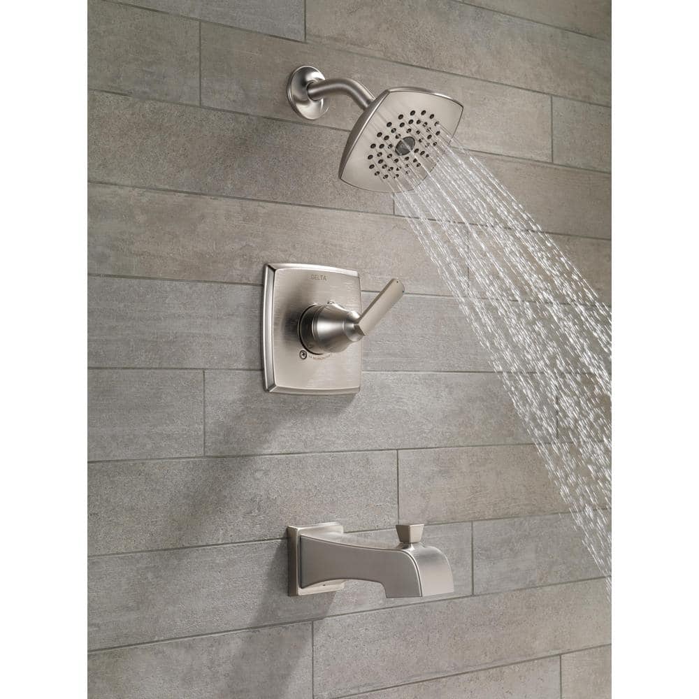 The Delta Ashlyn trim kit delivers a modern, squared profile in a durable stainless finish. Its Monitor pressure-balanced valve technology maintains a consistent water temperature, while Touch-Clean spray holes make the showerhead easy to keep free of buildup. Requires MultiChoice Universal Valve R10000-UNBX, sold separately.