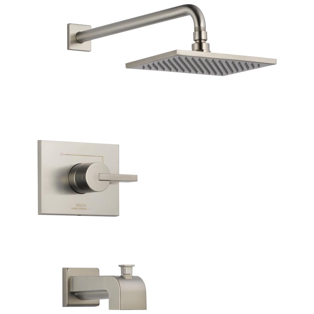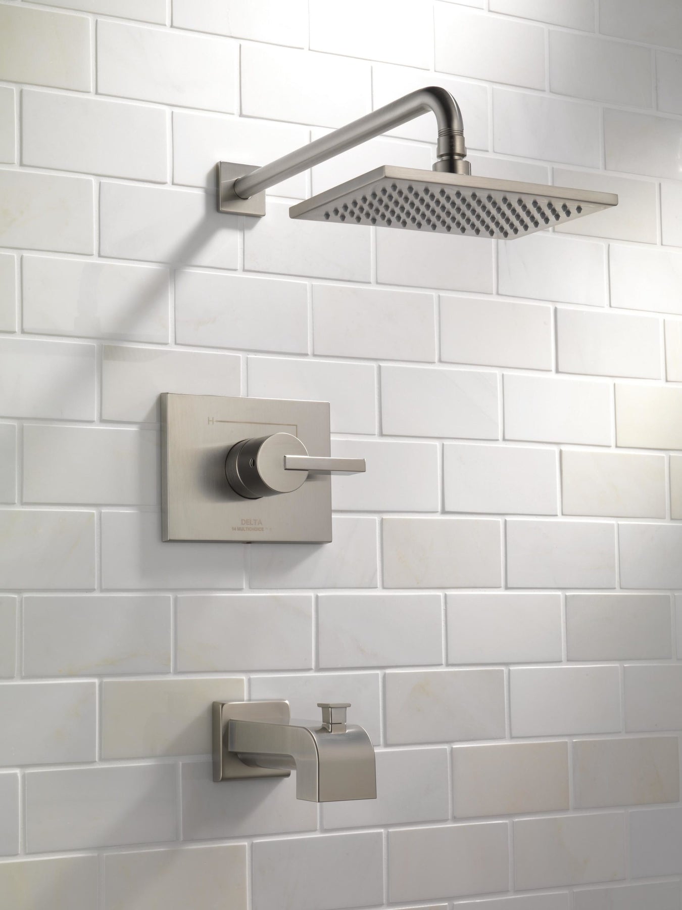 The Delta Vero tub and shower faucet trim kit delivers a sleek, modern look in Brilliance Stainless with a single-function square rain showerhead and matching tub spout. Monitor pressure-balance technology helps maintain consistent water temperature, while Touch-Clean spray holes make mineral buildup easy to wipe away.