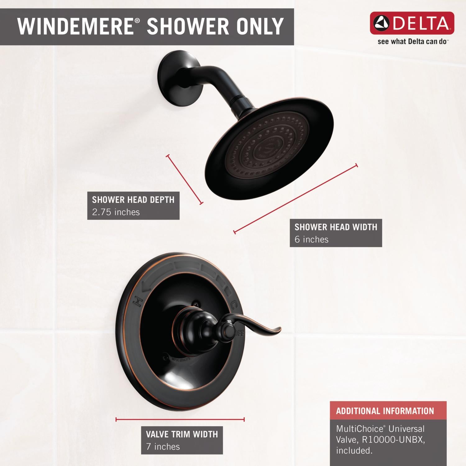 This Delta Windemere shower faucet pairs classic styling with reliable performance. The oil-rubbed bronze finish and lever handle operate a single-function, 6-in shower head while the included MultiChoice Universal valve provides consistent, safe water temperature.
