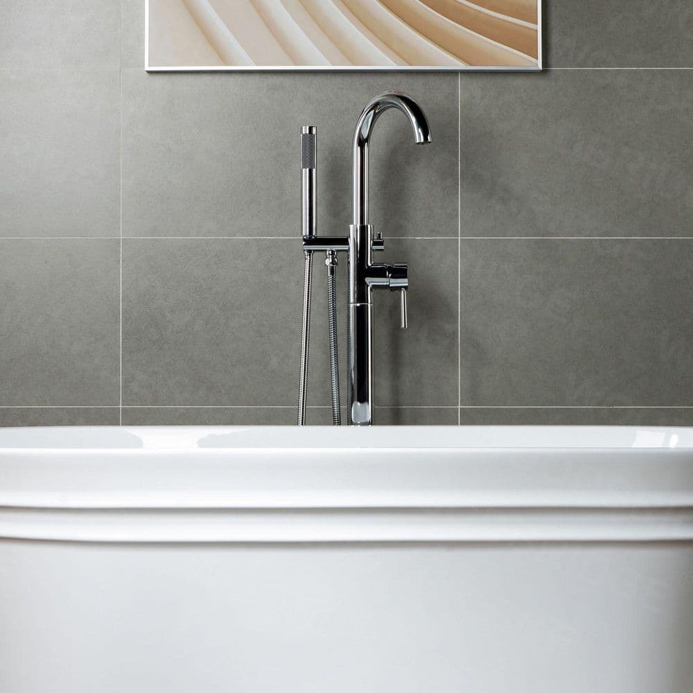 This sleek freestanding filler becomes a luminous column in the bath, catching light with its mirror-polished chrome. The graceful high-arc spout and slim wand shower feel refined and architectural. Pair it with a minimalist oval tub and soft, textured towels to heighten the serene vibe. It’s a small footprint with big presence—an essential touch of modern luxury.