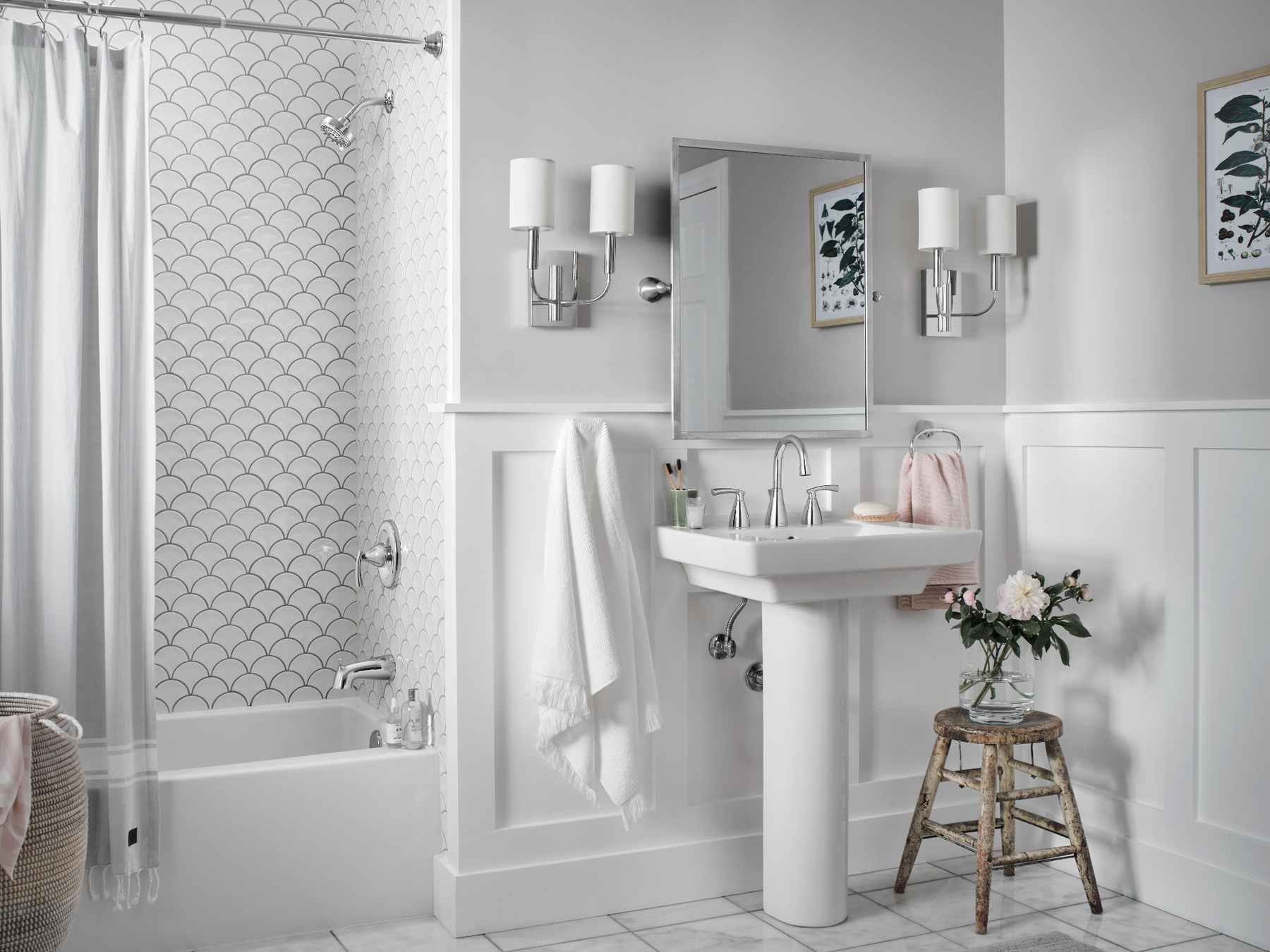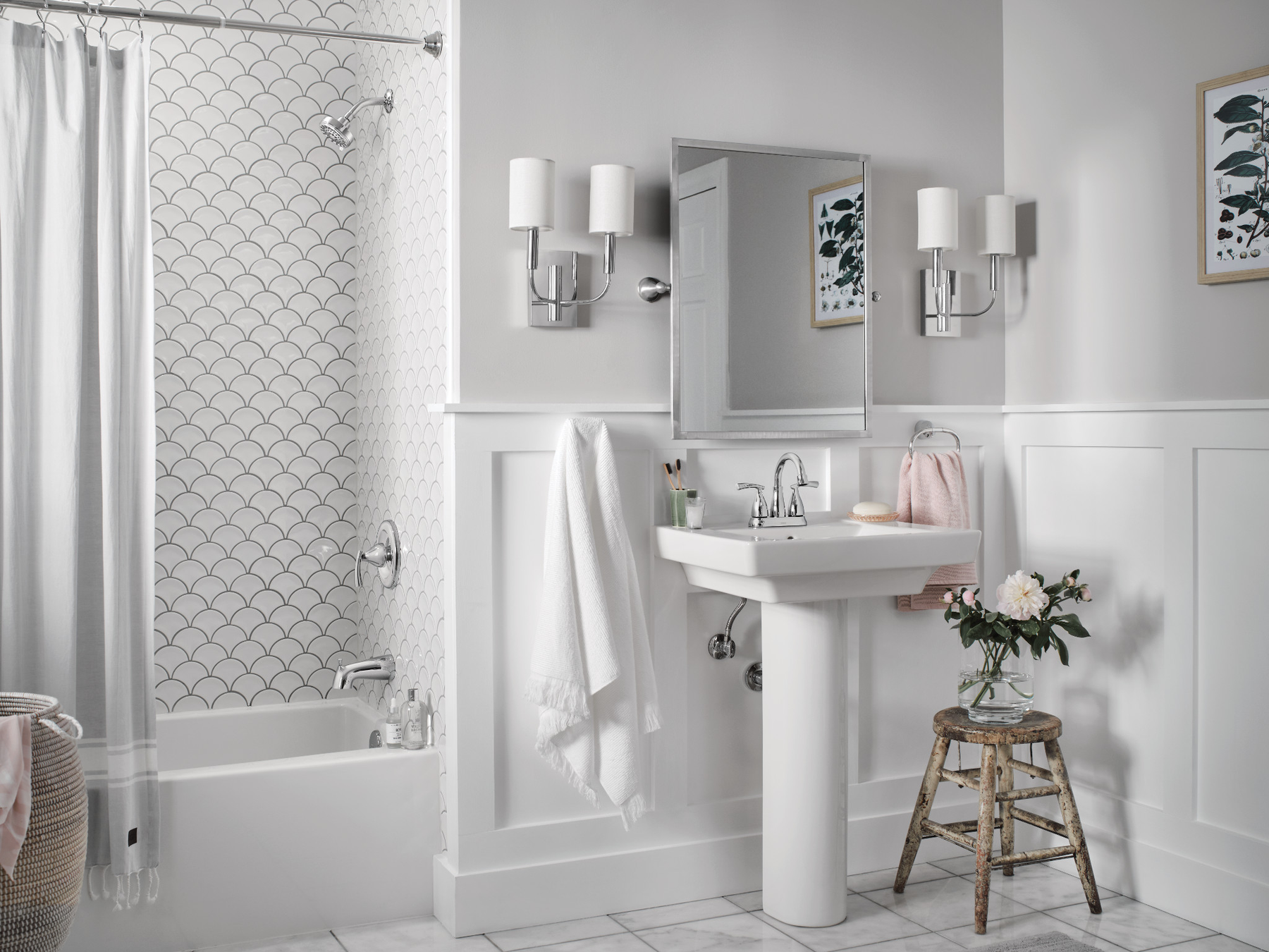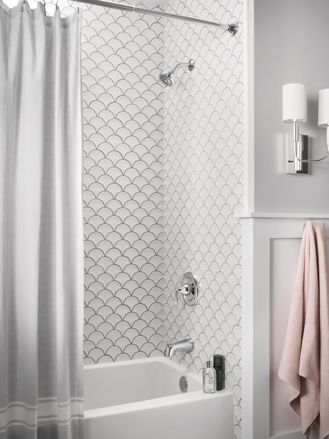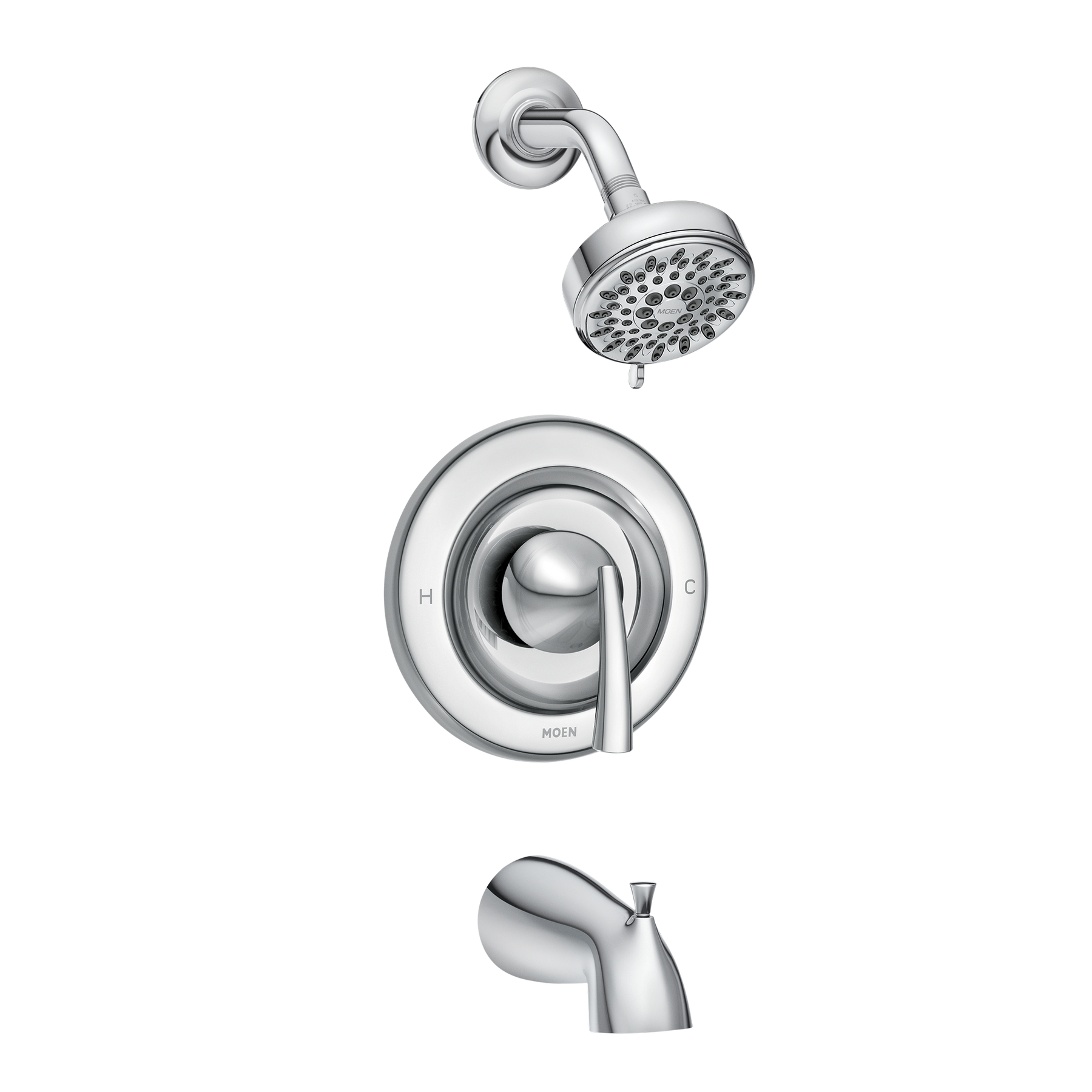 Refresh your bath with the Moen Essie tub and shower set, featuring a single lever handle and a 5-function eco‑performance showerhead. Built on the Posi‑Temp pressure‑balancing valve for consistent temperatures, this chrome combo delivers WaterSense efficiency without sacrificing performance.
