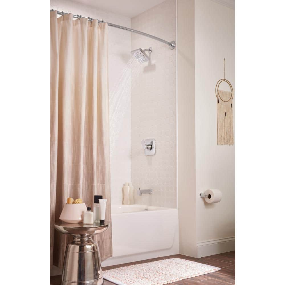 Sleek and modern, the Moen Genta tub and shower combo pairs a square rain-style head and lever handle with a matching tub spout and curved shower rod in a brilliant chrome finish. Built on Moen’s M‑PACT system with a Posi-Temp pressure‑balancing valve, it maintains consistent temperature while meeting WaterSense at 1.75 GPM.