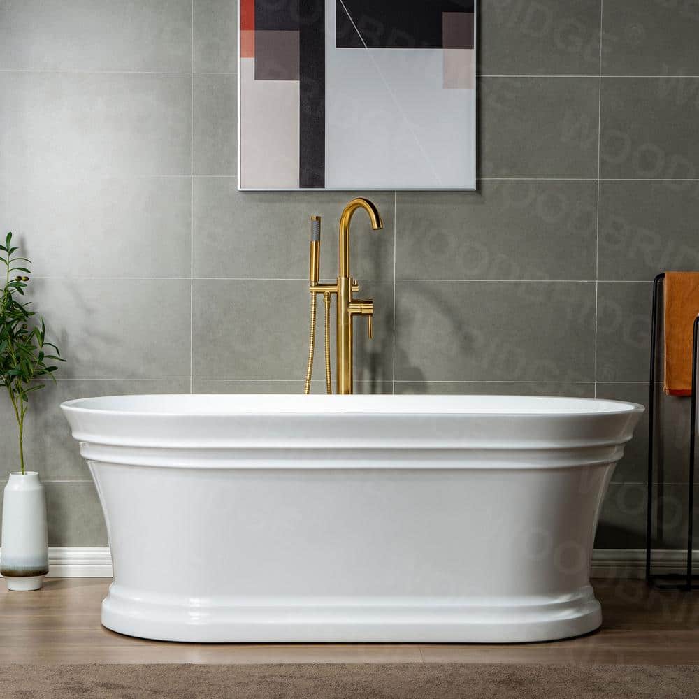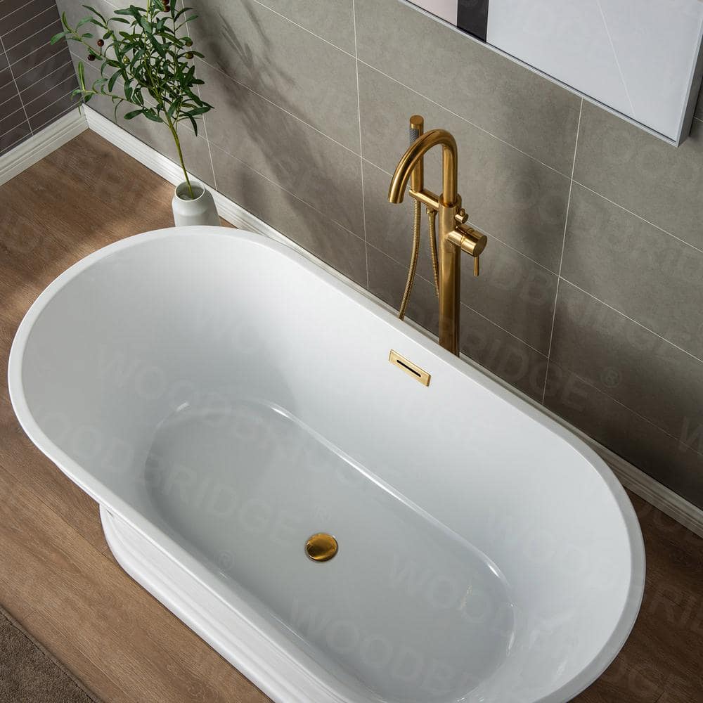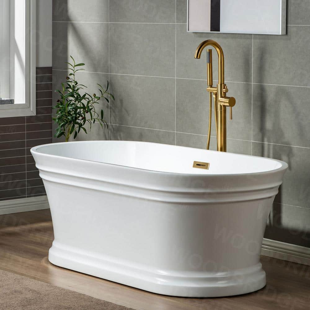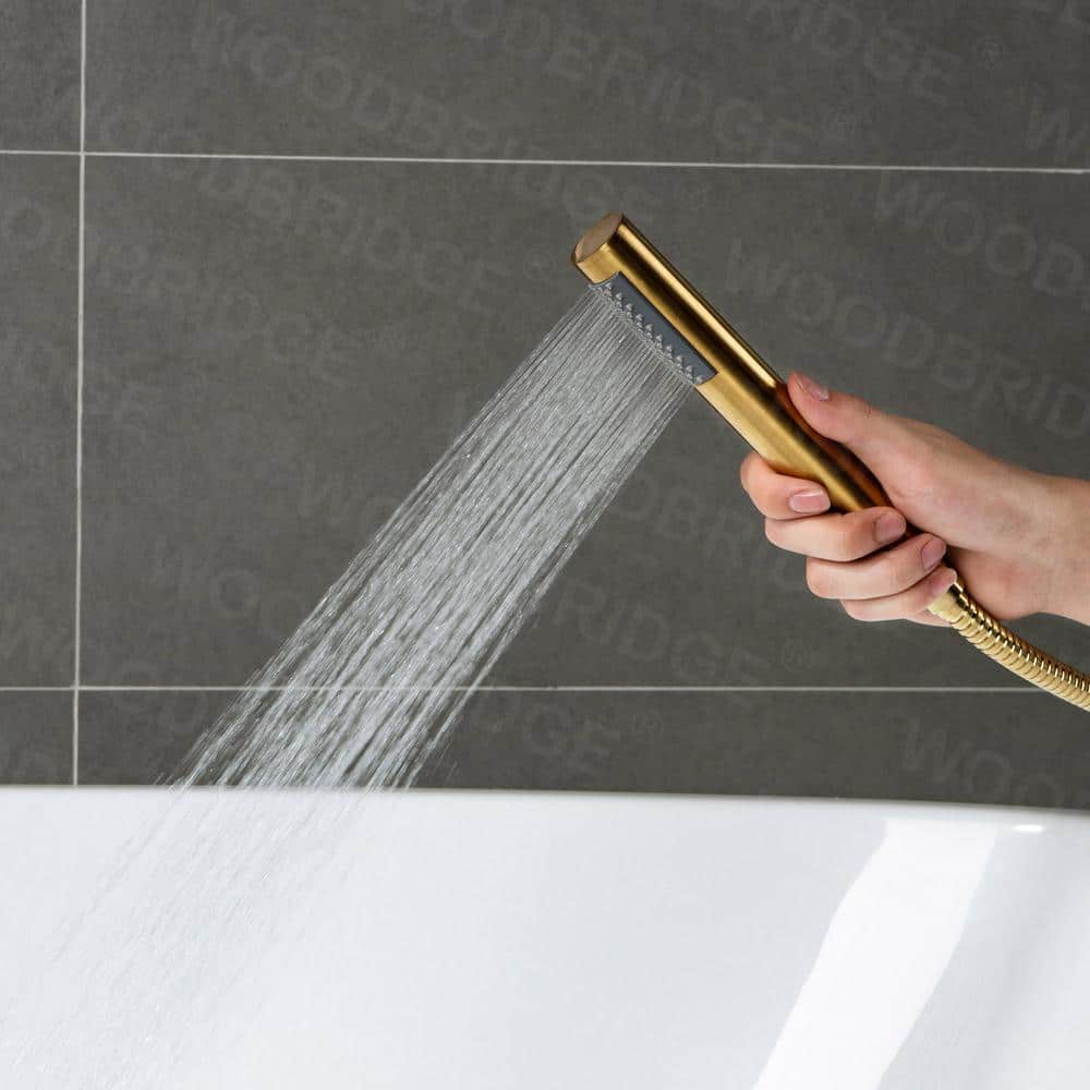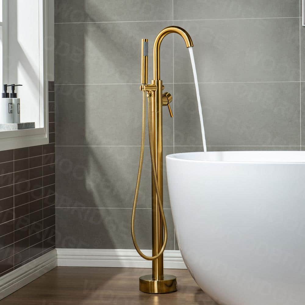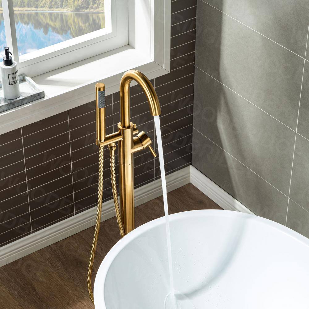A modern floor-mount tub filler crafted from solid brass with a brushed gold finish. Features a high-arc 360° swivel spout and a matching hand shower for versatile rinsing, delivering strong flow while resisting corrosion and mineral buildup.