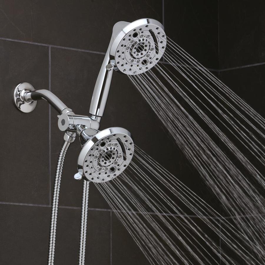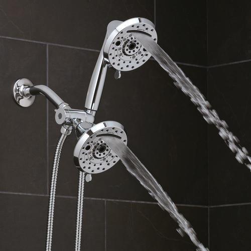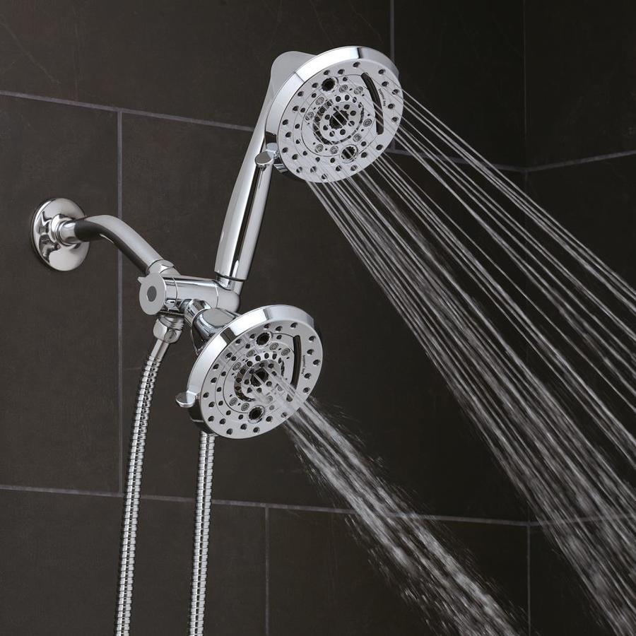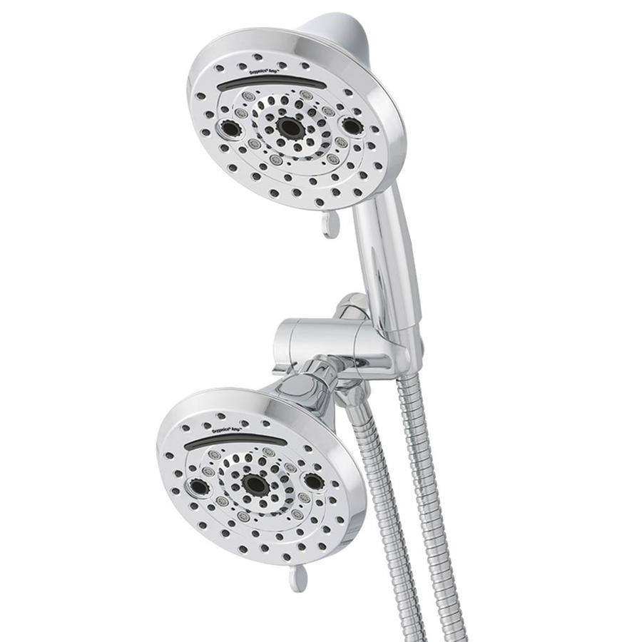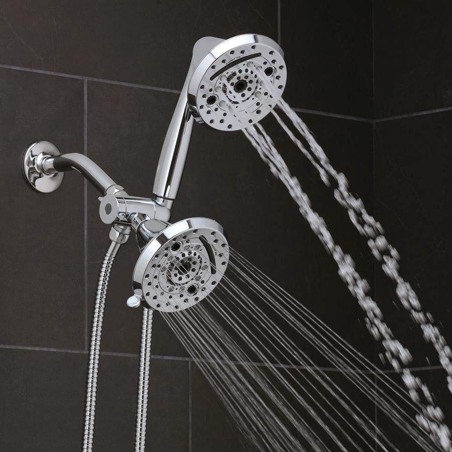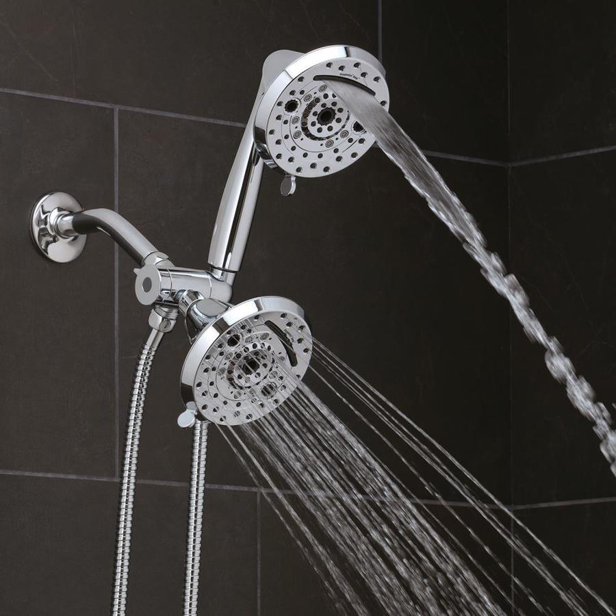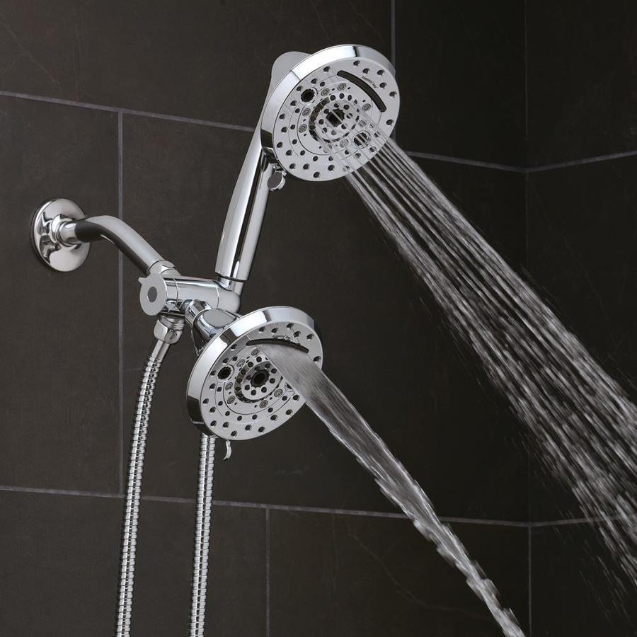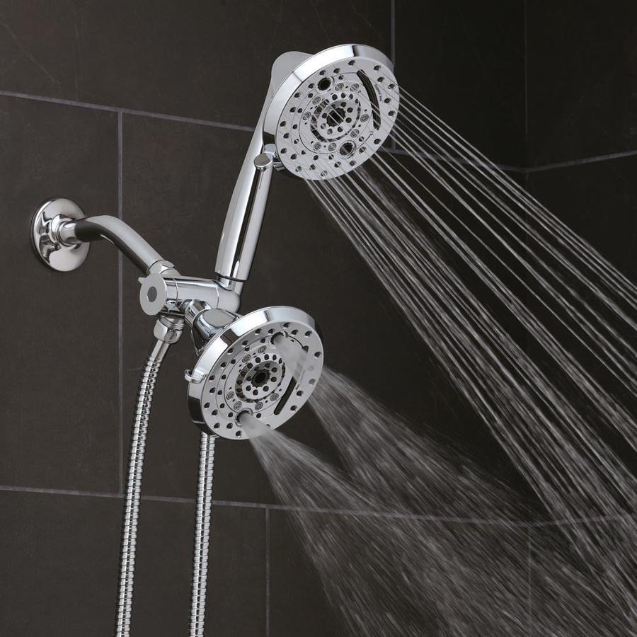 Dual 10-setting shower heads provide up to 120 spray combinations Shower heads can be used individually or together with the included 3-way diverter 5-inch large face for improved spray coverage Includes a 72-inch stainless steel hose for expanded reach and ease of rinsing Industrial grade acetal resin components eliminate clogging, mineral and hard water build-up WaterSense certified to flow at 2.0 GPM even with both heads running Includes a unique Waterfall feature Limited lifetime warranty against failure or clogging