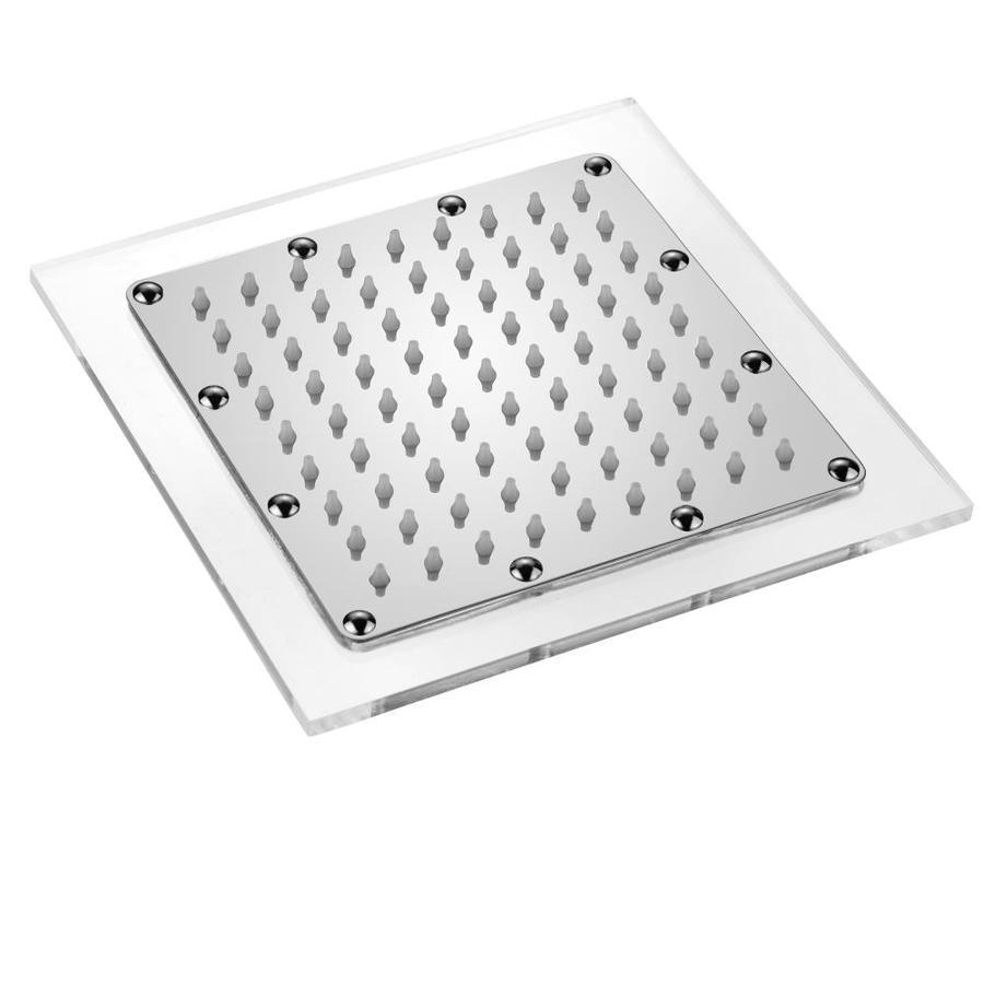 8 In. square shower head with extension arm Sleek, modern slimline showerhead with clear acrylic rim 8 inch extra-wide face for better body coverage Stainless steel construction Mounts on wall or ceiling 81 Easy to clean rub-clean jets 12 In. solid brass height and angle adjustable extension arm 2 foot vertical movement range