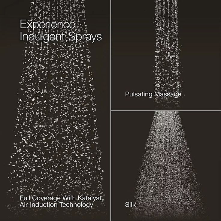 Advanced spray engine provides three experiences: full coverage, pulsating massage and silk spray Full coverage spray produces an encompassing spray for everyday use and utilizes Katalyst air induction to create large, full drops Pulsating massage spray targets sore muscles to ease away aches and pains Silk spray releases a dense, luxurious spray ideal for rinsing Thumb tab allows for a smooth transition between sprays MasterClean spray nozzles prohibit mineral buildup for easy cleaning 2.5 GPM (gallons per minute) flow rate Shower arm and flange not included Coordinates with Forte, Alteo, and Refinia faucets and accessories