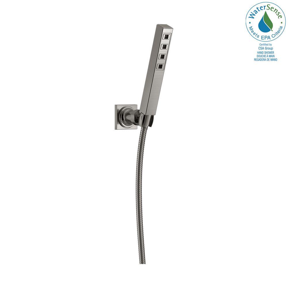 The modern, angular Ara 1-Spray 2.0 GPM Hand Shower in Stainless featuring H2Okinetic brings a contemporary edge to any home. It's a full bath suite with matching accessories, making it easy to perfectly coordinate your space. The feeling of more water, without using more water. H2Okinetic showers are different than any other shower experience, in the way they feel and the way they perform. Larger water droplets move in a unique wave pattern, providing warmer, more drenching coverage, all at a standard flow rate.