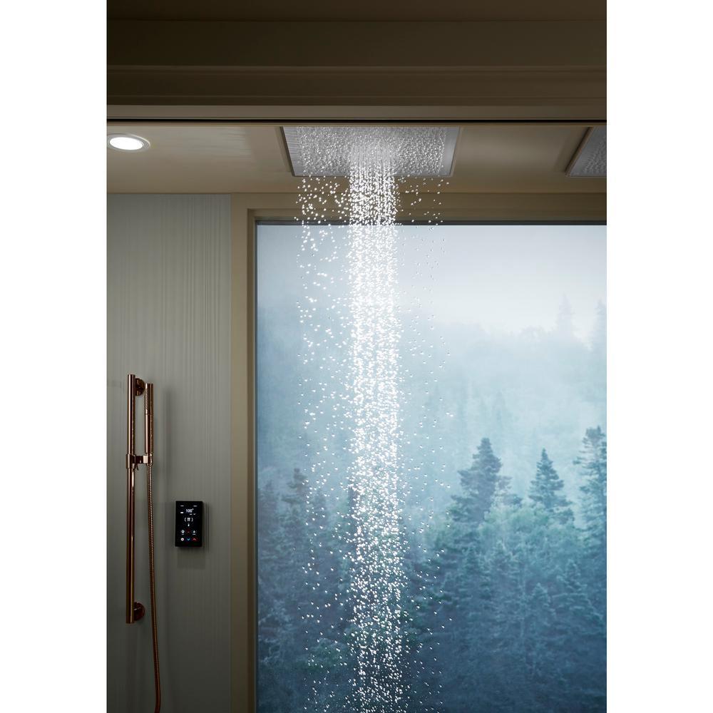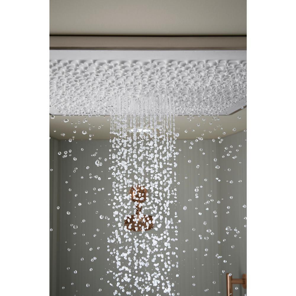 Experience the gentle buildup of a warm summer rainstorm in your shower. The Rain Real overhead panel is designed with a water reservoir that relies on gravity to shape individual drops that replicate rainfall. When the reservoir fills, water spills into the remainder of the showerhead, covering over 775 nozzles, and raindrops begin to fall softly and slowly then grow in strength and speed until the shower feels, sounds, and looks like a warm summer rain. Push a button and the Deluge feature releases a reservoir of water in 1 powerful instant to simulate an energetic burst of heavy rain.