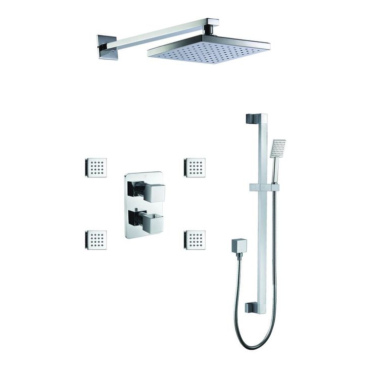 • Complete shower set includes: water diverter, temperature control, on/off control, rain showerhead, handheld showerhead, 4 body sprays