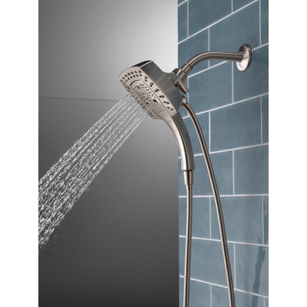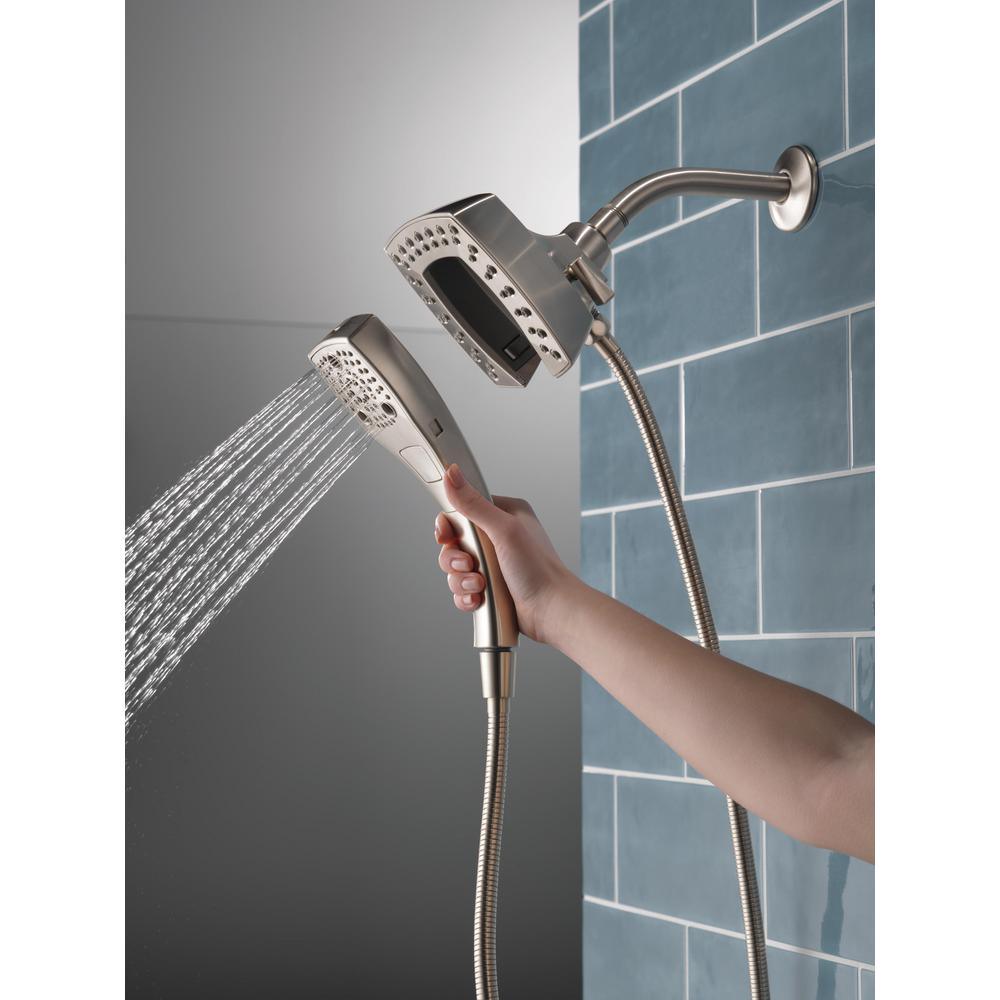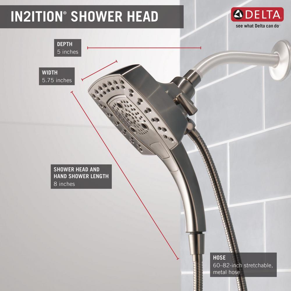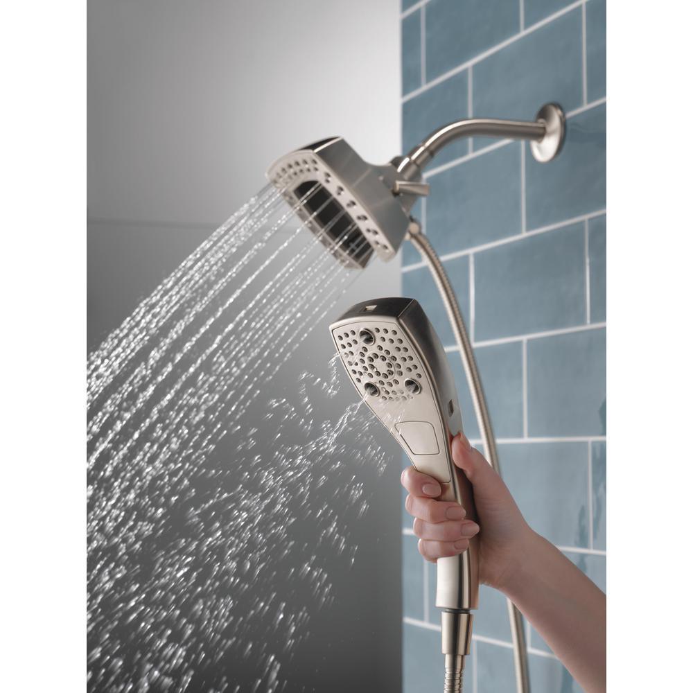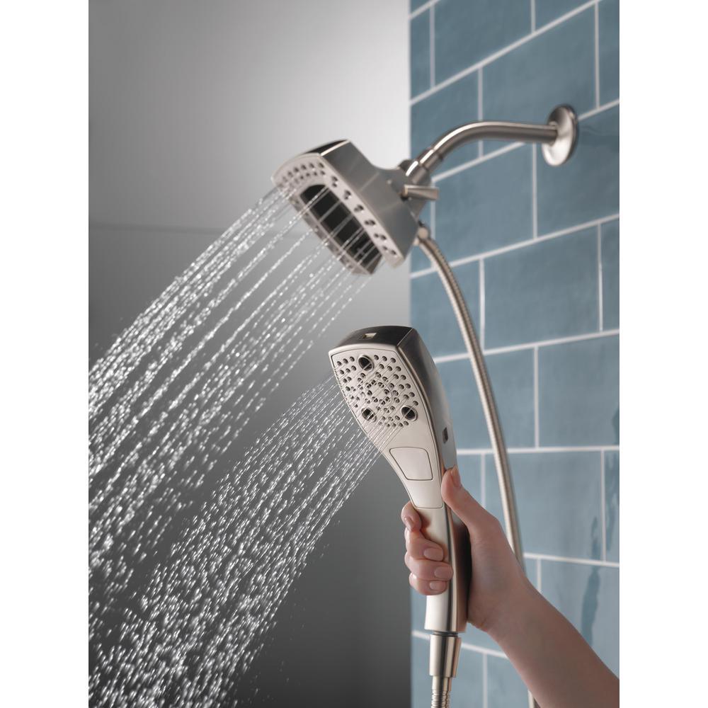 The In2ition Two-in-One Shower features a detachable hand shower which can be used separately from or simultaneously with the shower head. This integrated dual-functionality gives you maximum flexibility without sacrificing warmth, as you can choose to have water streaming from the shower head only, the hand shower only or both the shower head and hand shower at once. Delta H2Okinetic Power Drench Showers look different because they are different. H2Okinetic showers are powered by an innovative technology that sculpts the water into a unique wave pattern, giving you the feeling of more water without using more water and creating a shower with more warmth, coverage and intensity. So go ahead and indulge, because now you can enjoy the feeling of more water without using more water. While other products may gather unsightly mineral build-up over time, Delta soft rubber Touch-Clean spray holes allow any mineral residue to simply be wiped away for an instantly refreshed look with no need for soaking or the aid of chemical cleaners. The pause setting gives you ample space for shaving, lathering and other shower tasks, without worrying about overspray or water waste. This spray setting helps you conserve water, so you can worry less about depleting your supply of hot water - and you help the environment too.